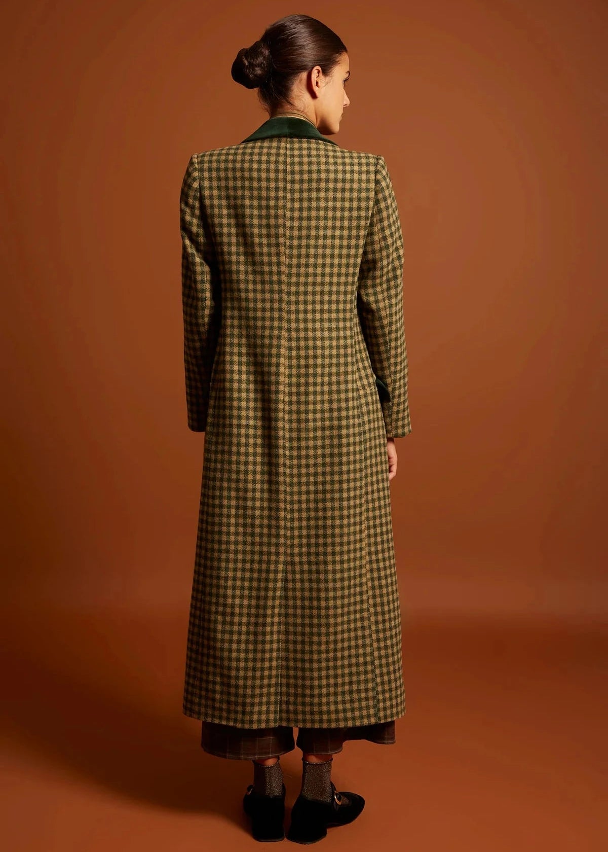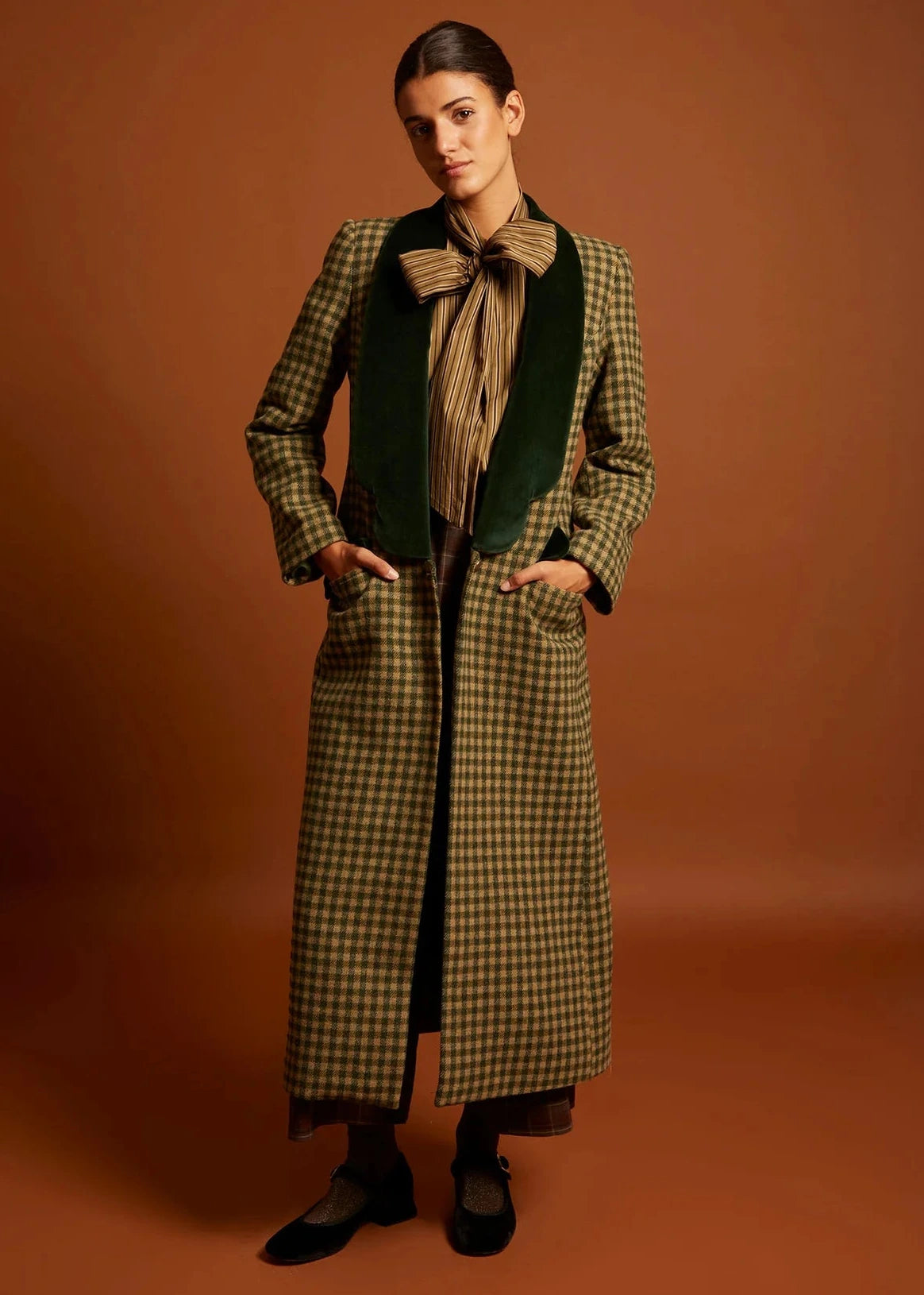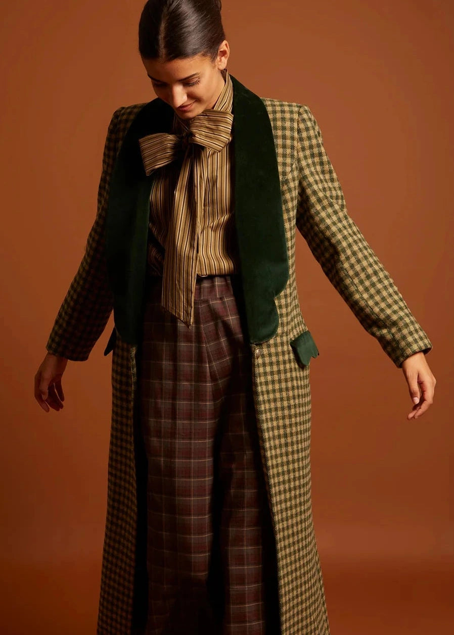 El Abrigo Gaspari Verde es la prenda perfecta para elevar tus looks de otoño/invierno con un toque sofisticado y atemporal. Su tejido de espiga en tonos verdes y beige combina a la perfección con la solapa de terciopelo verde oscuro, aportando elegancia y textura a cualquier outfit.