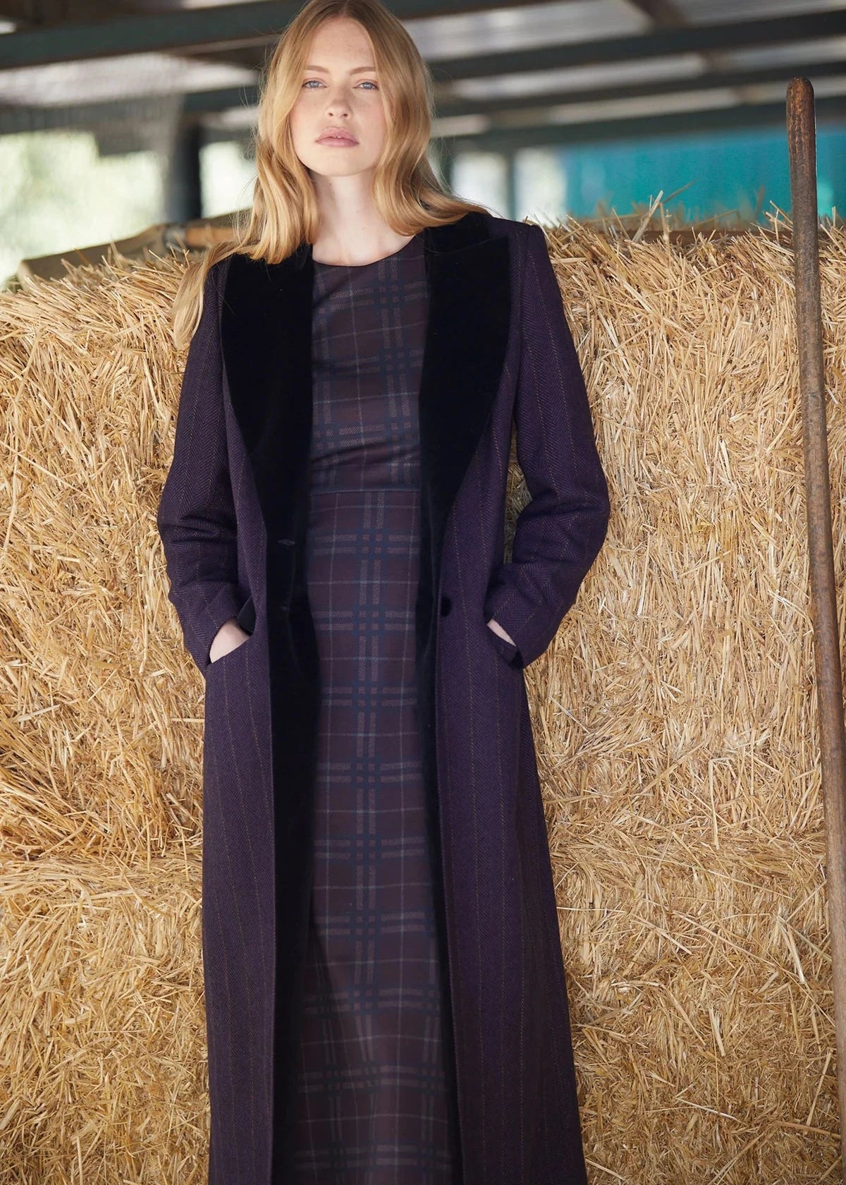 Abrigo Harry largo con un corte estructurado y estilizador, destaca por su tejido con sutiles rayas diplomáticas, su cuello amplio en contraste y sus detalles aterciopelados que aportan un acabado refinado y exclusivo.