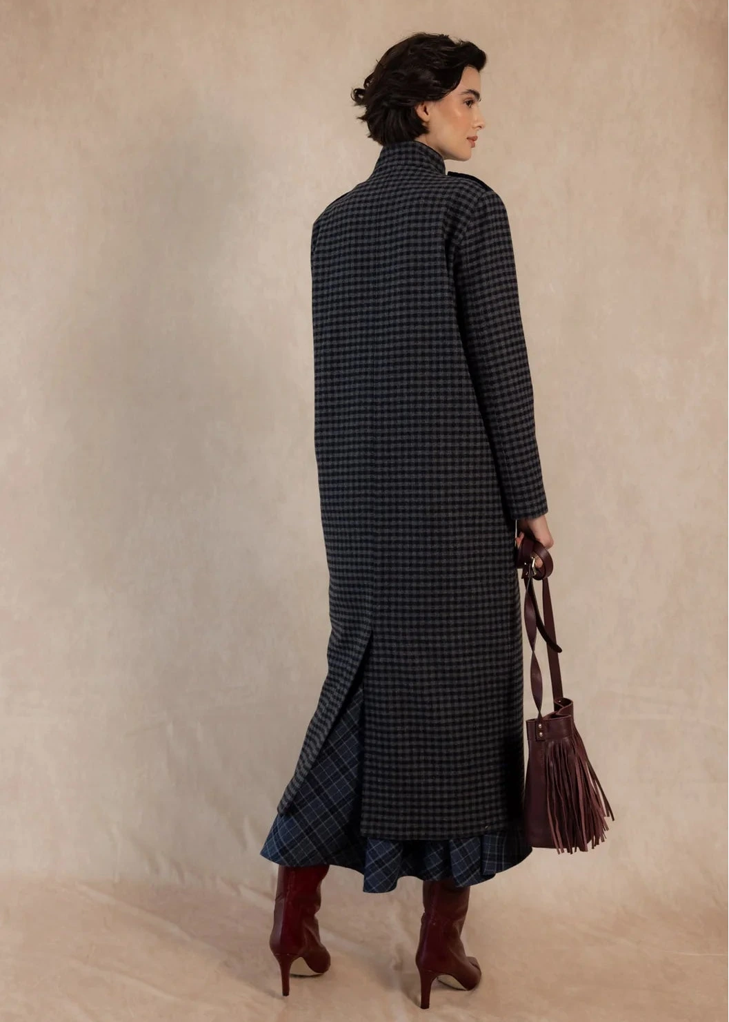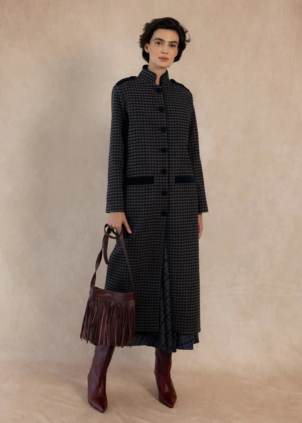 El abrigo Otilia es una pieza icónica que redefine la elegancia atemporal. Confeccionado en un tejido de cuadros finos en tonos oscuros, combina estilo clásico y sofisticación moderna. Su corte largo y estructurado estiliza la silueta, mientras el cuello mao y los botones forrados aportan un toque refinado y distintivo.