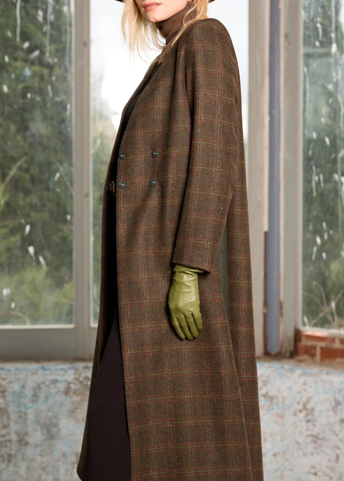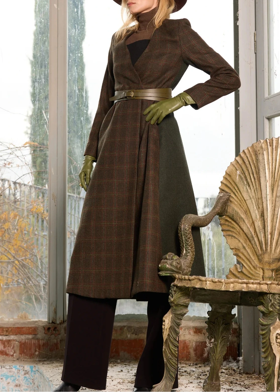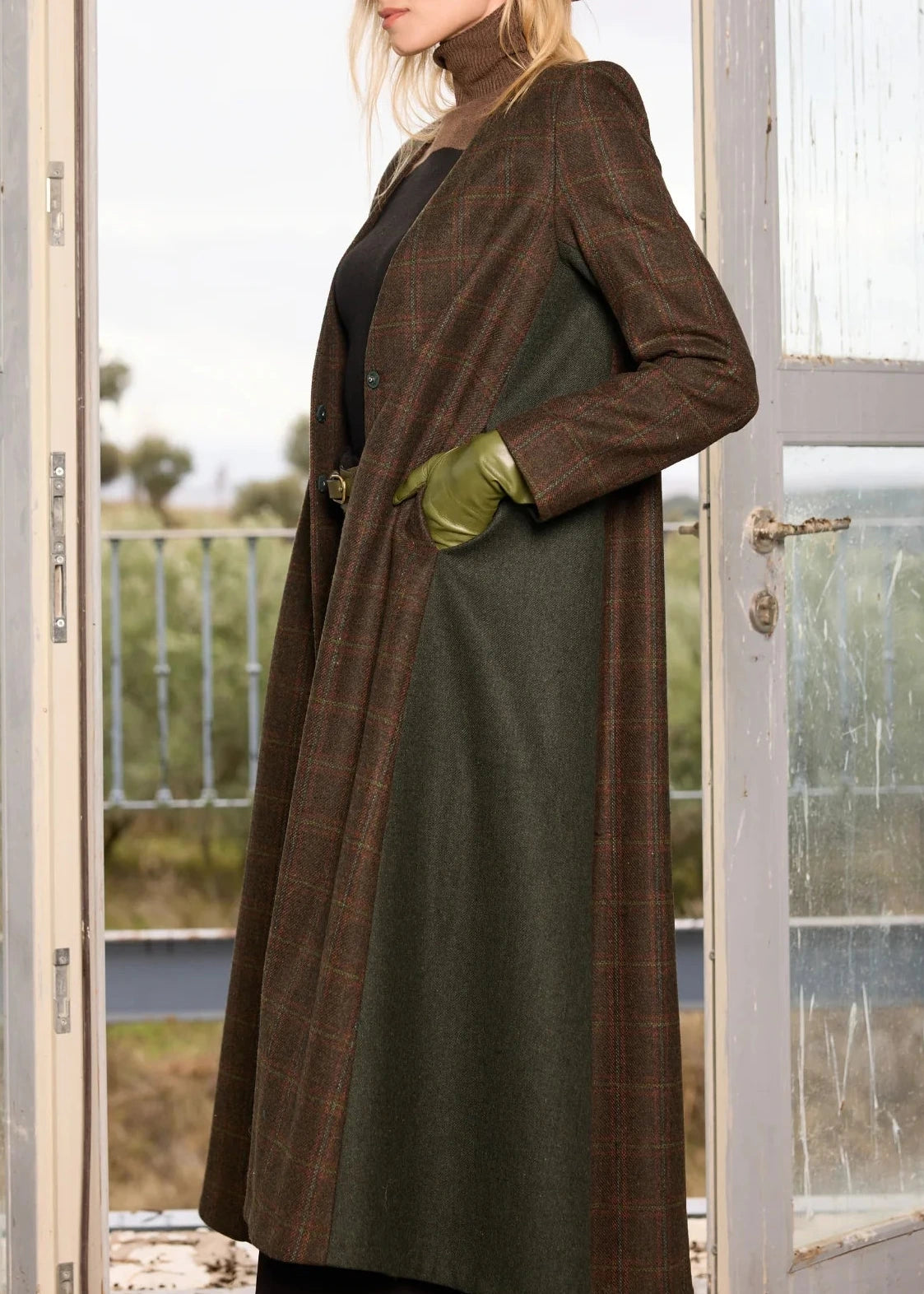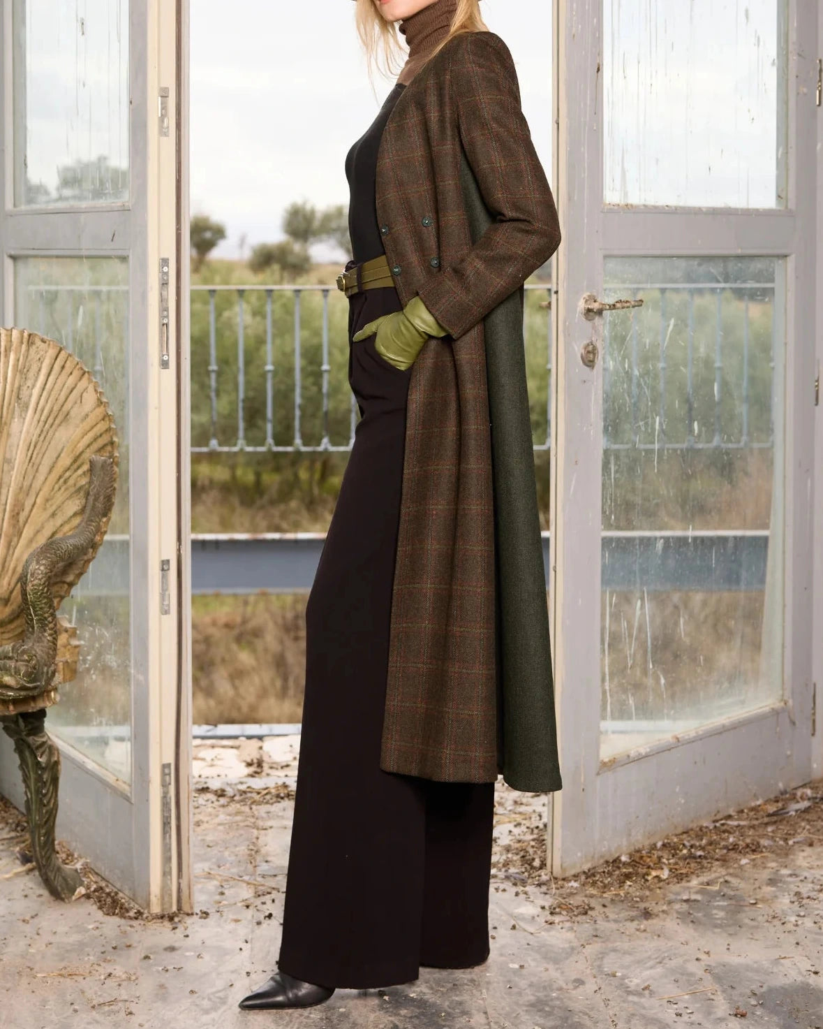 Abrigo Romero confeccionado con lana de alta calidad de cuadros verdes y detalle de tejido liso verde en lateral.