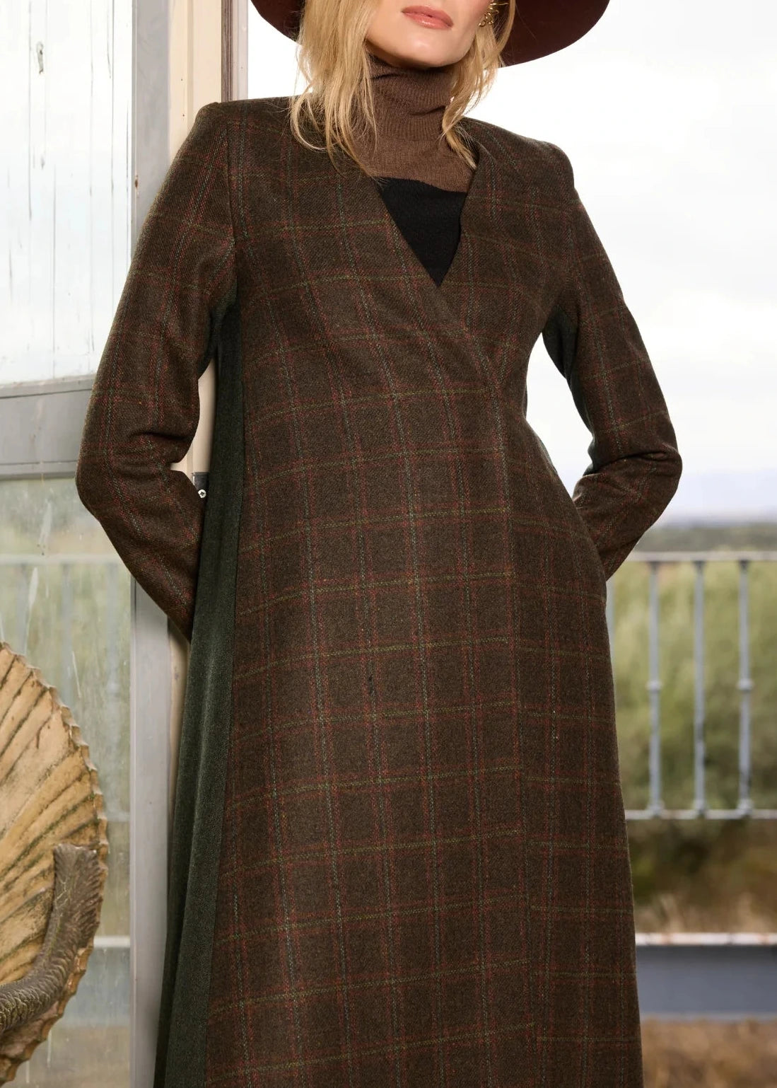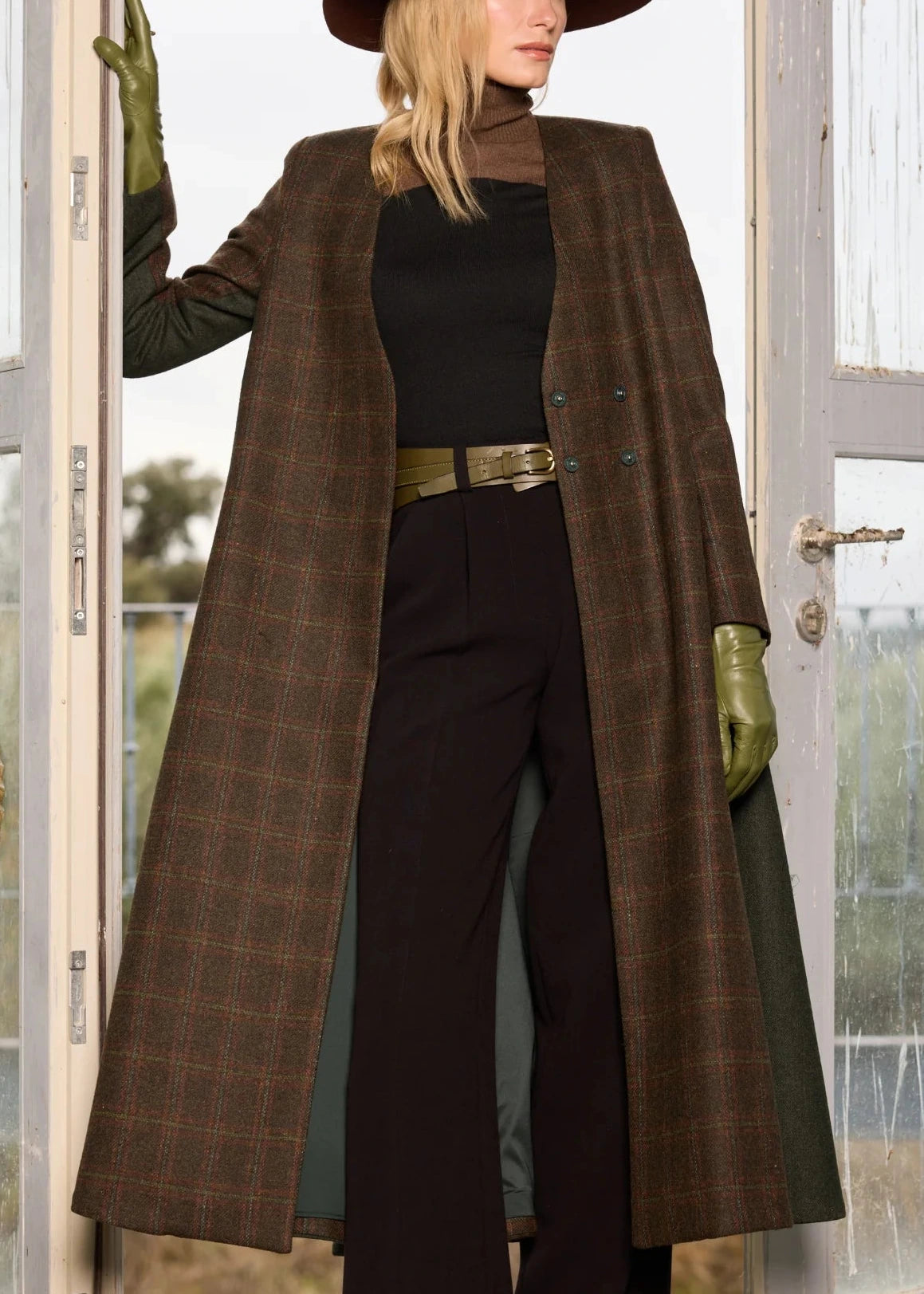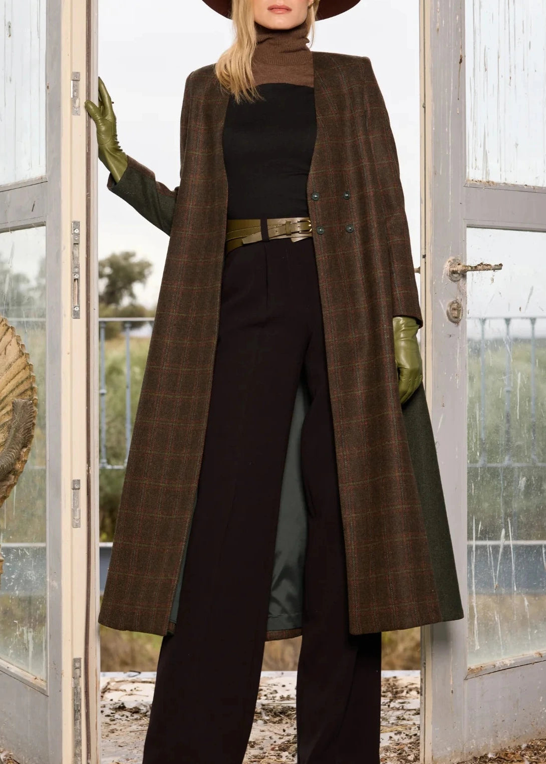 Abrigo Romero confeccionado con lana de alta calidad de cuadros verdes y detalle de tejido liso verde en lateral.