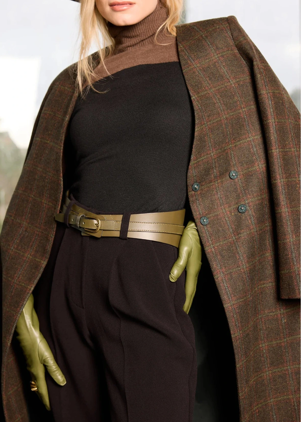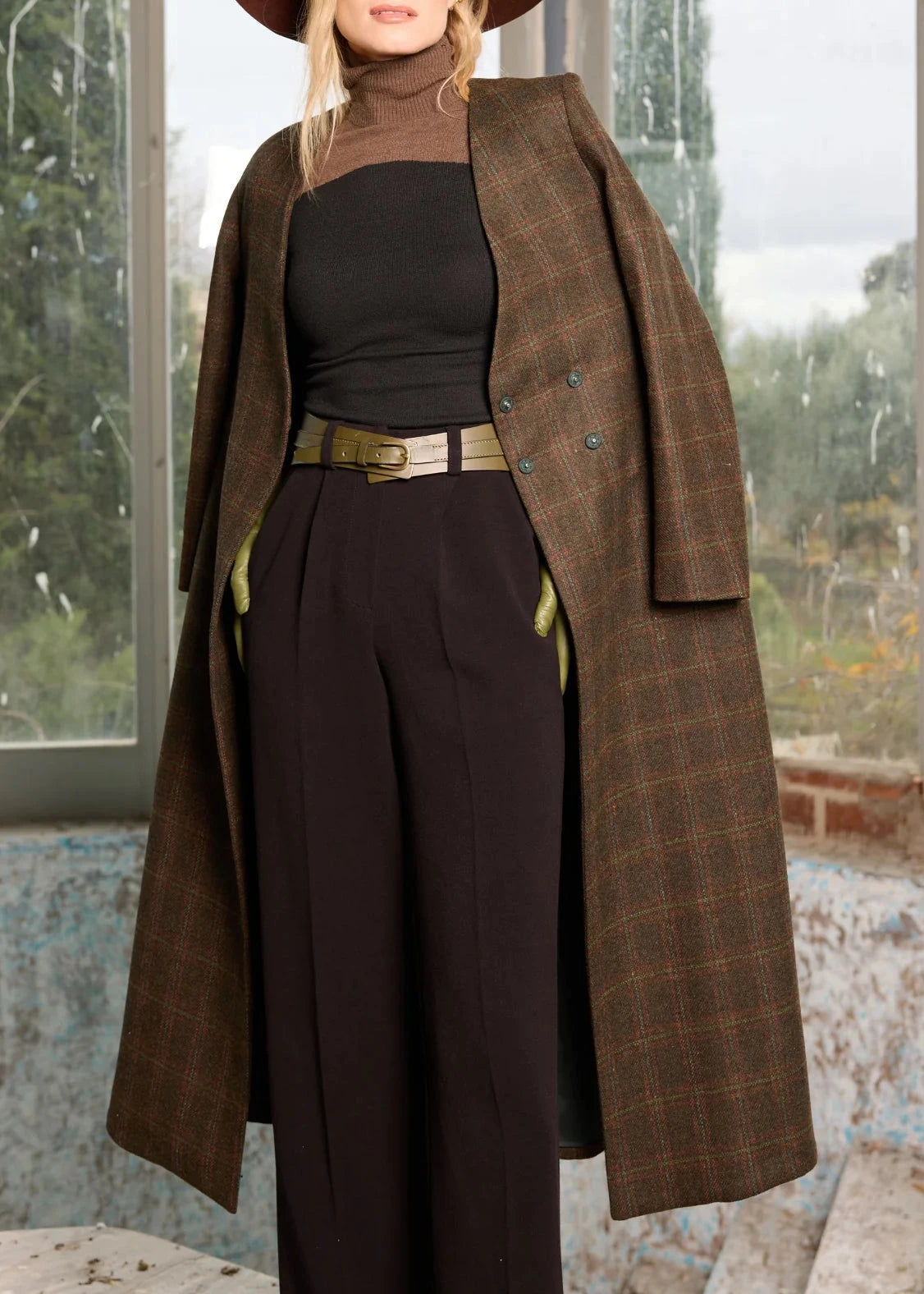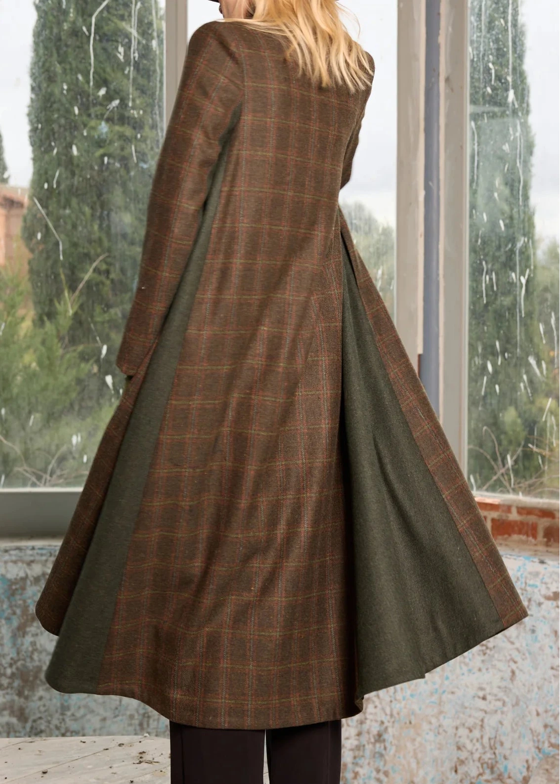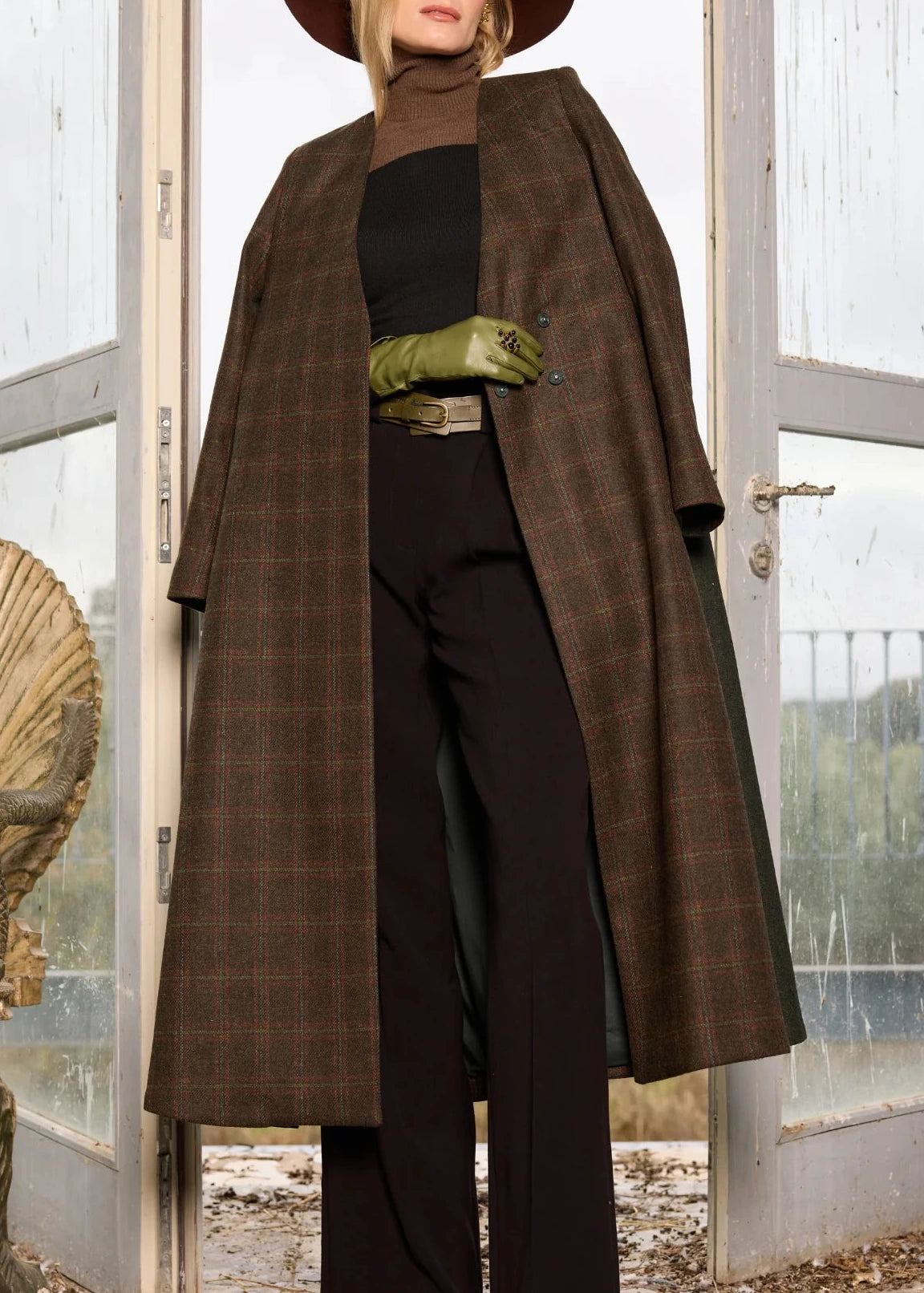 Abrigo Romero confeccionado con lana de alta calidad de cuadros verdes y detalle de tejido liso verde en lateral.