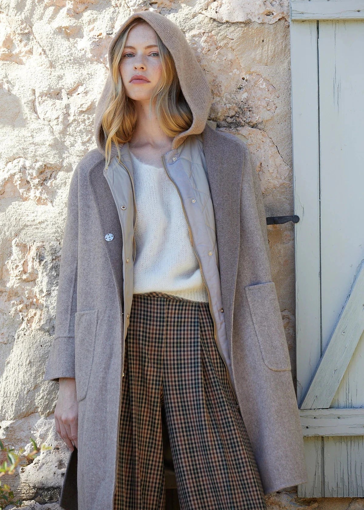 El abrigo Verdiana 2 en 1 incluye un interior acolchado tipo plumas con capucha, ideal para los días más fríos, y un abrigo exterior de lana con bolsillos de parche que aporta un toque elegante y minimalista.