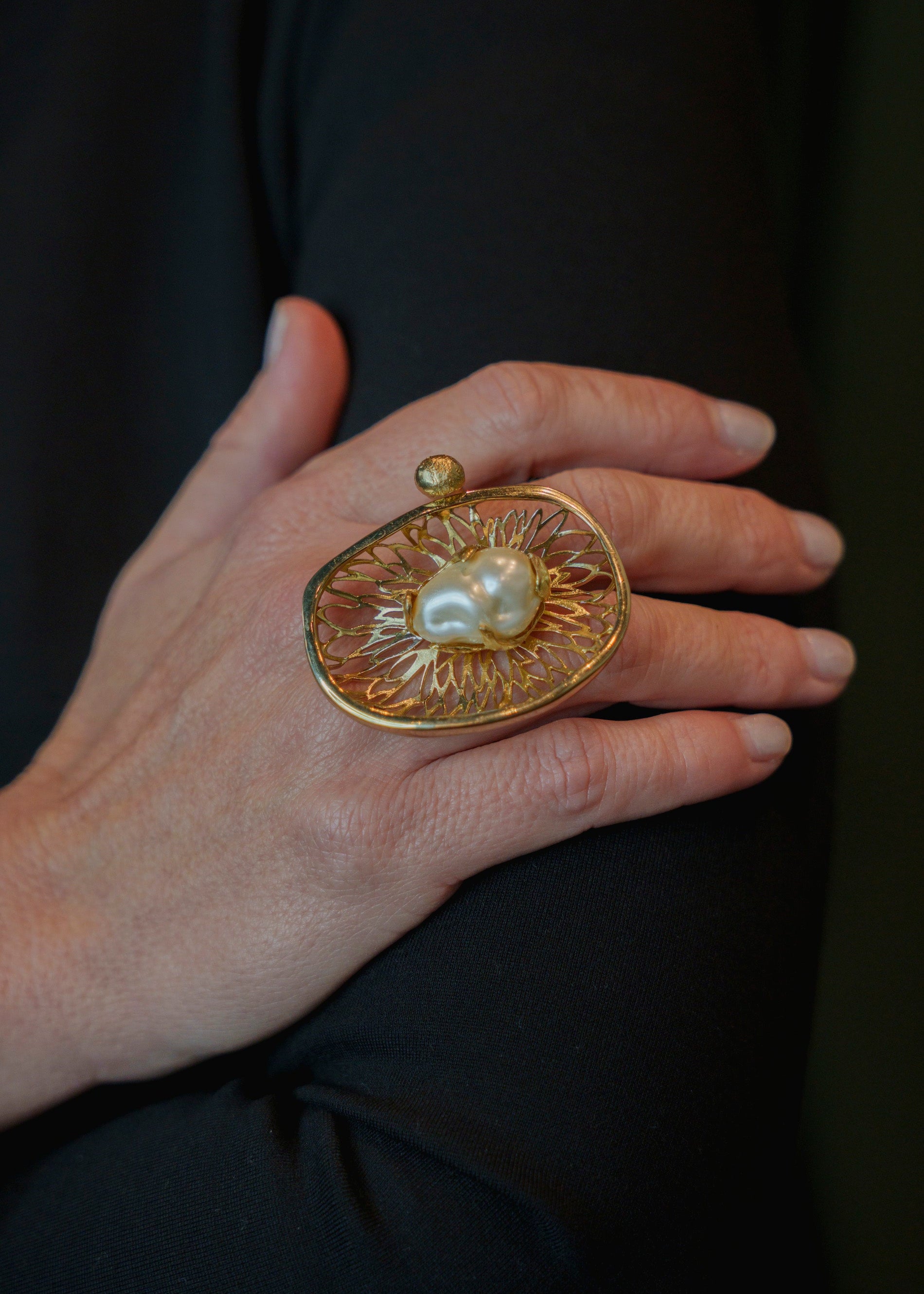 Anillo Cream dorado, de bronce bañado en oro y perla.