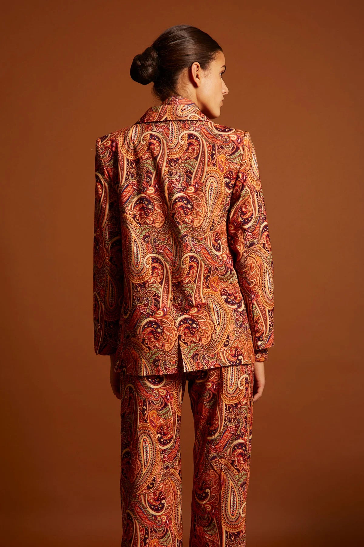 Blazer Casilda con estampado paisley, diseñada en tonos cálidos y vibrantes que aportan sofisticación y originalidad a tu look.
