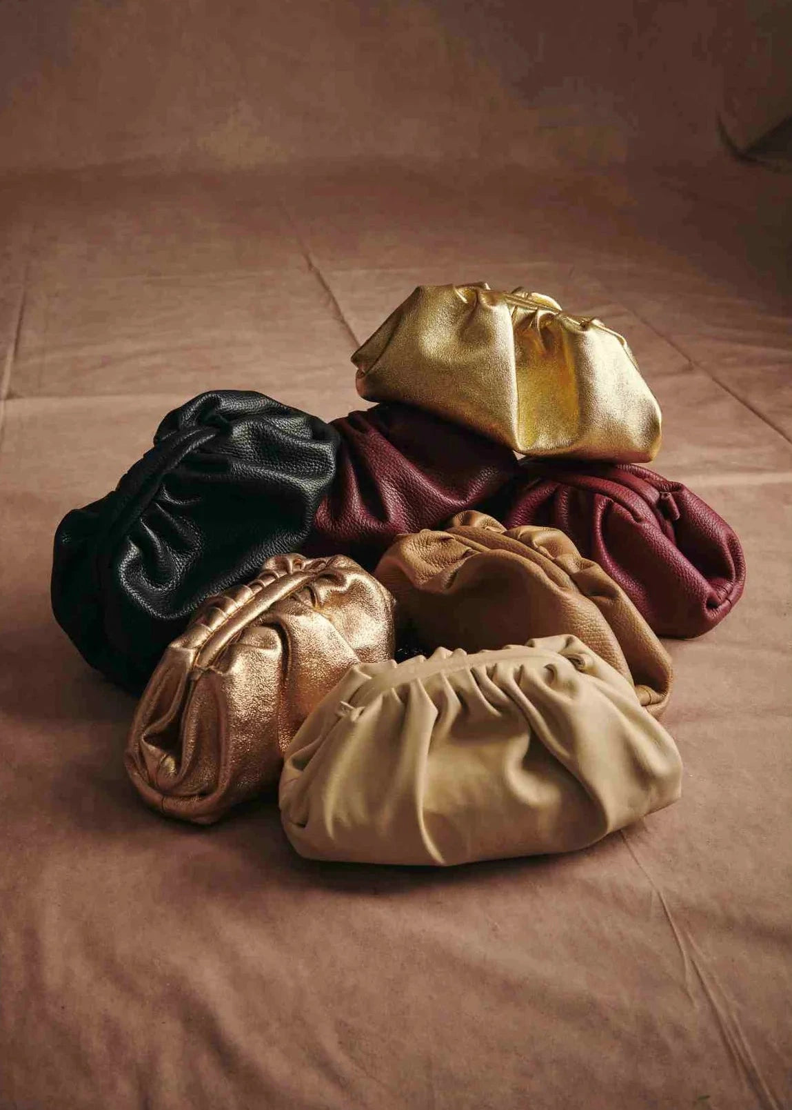 Bolso de mano negro. Su diseño tipo clutch fruncido, elaborado en un tejido con textura, combina modernidad y elegancia en una silueta atemporal.