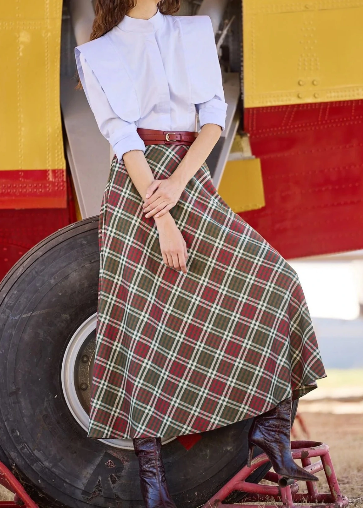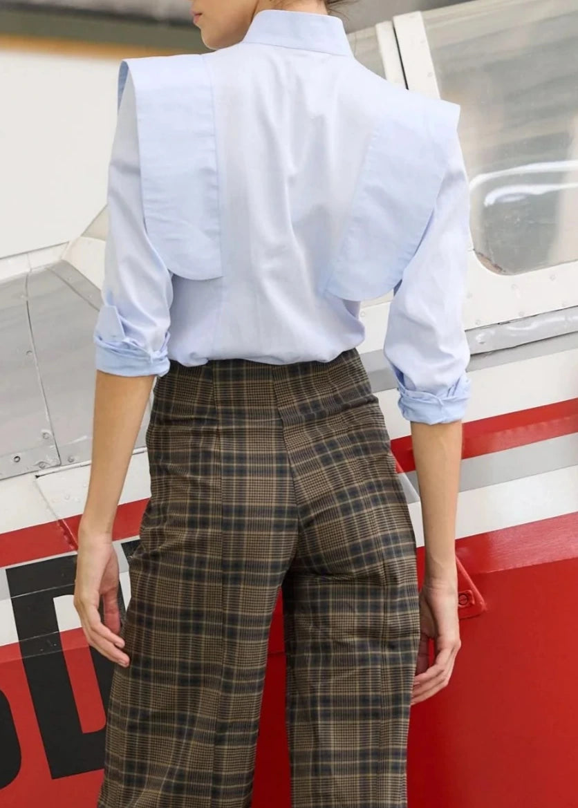 Camisa Anna en color azul celeste con cuello de tirilla y detalles en los hombros en parte delantera y trasera. Cierre delantero con botones.