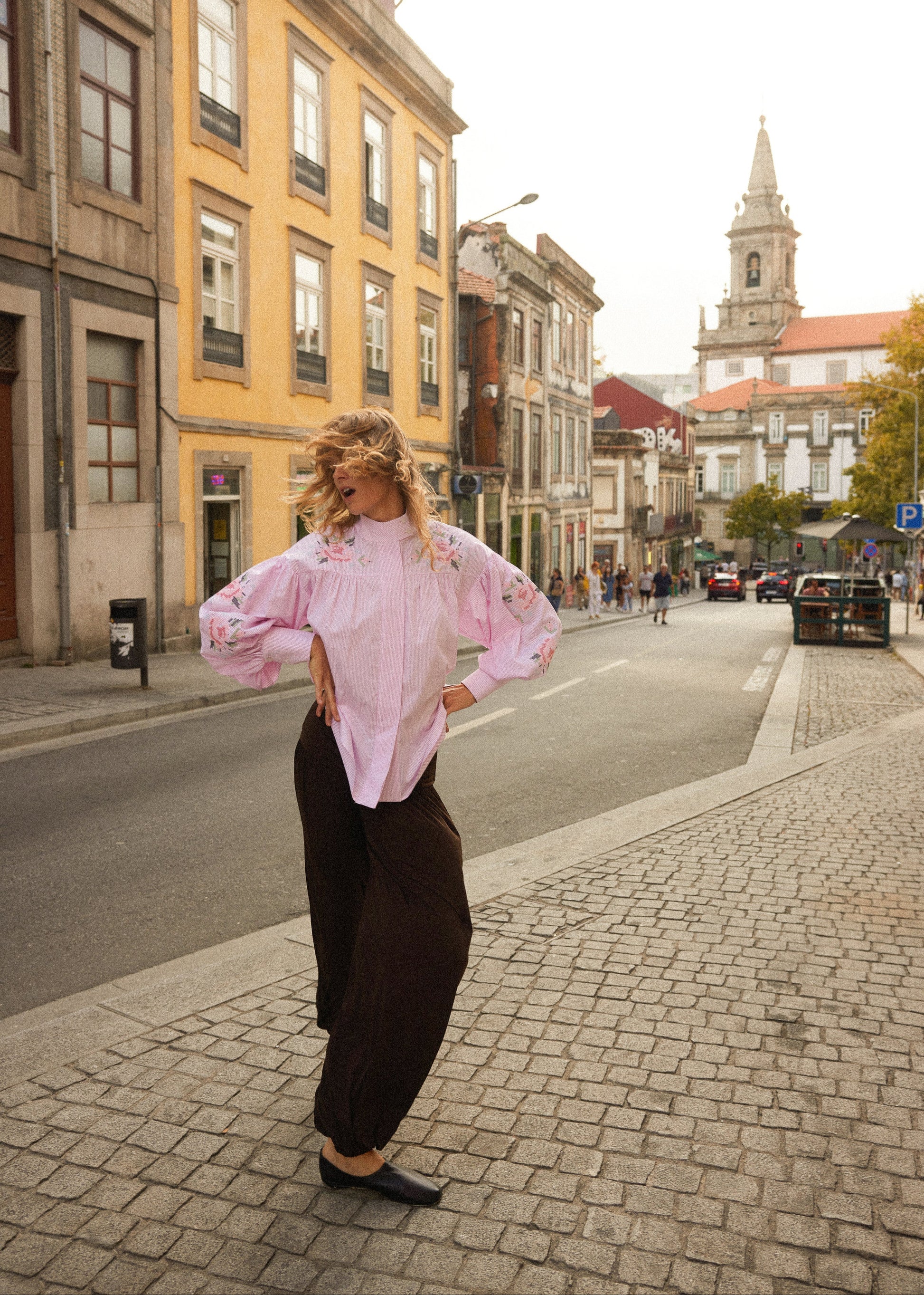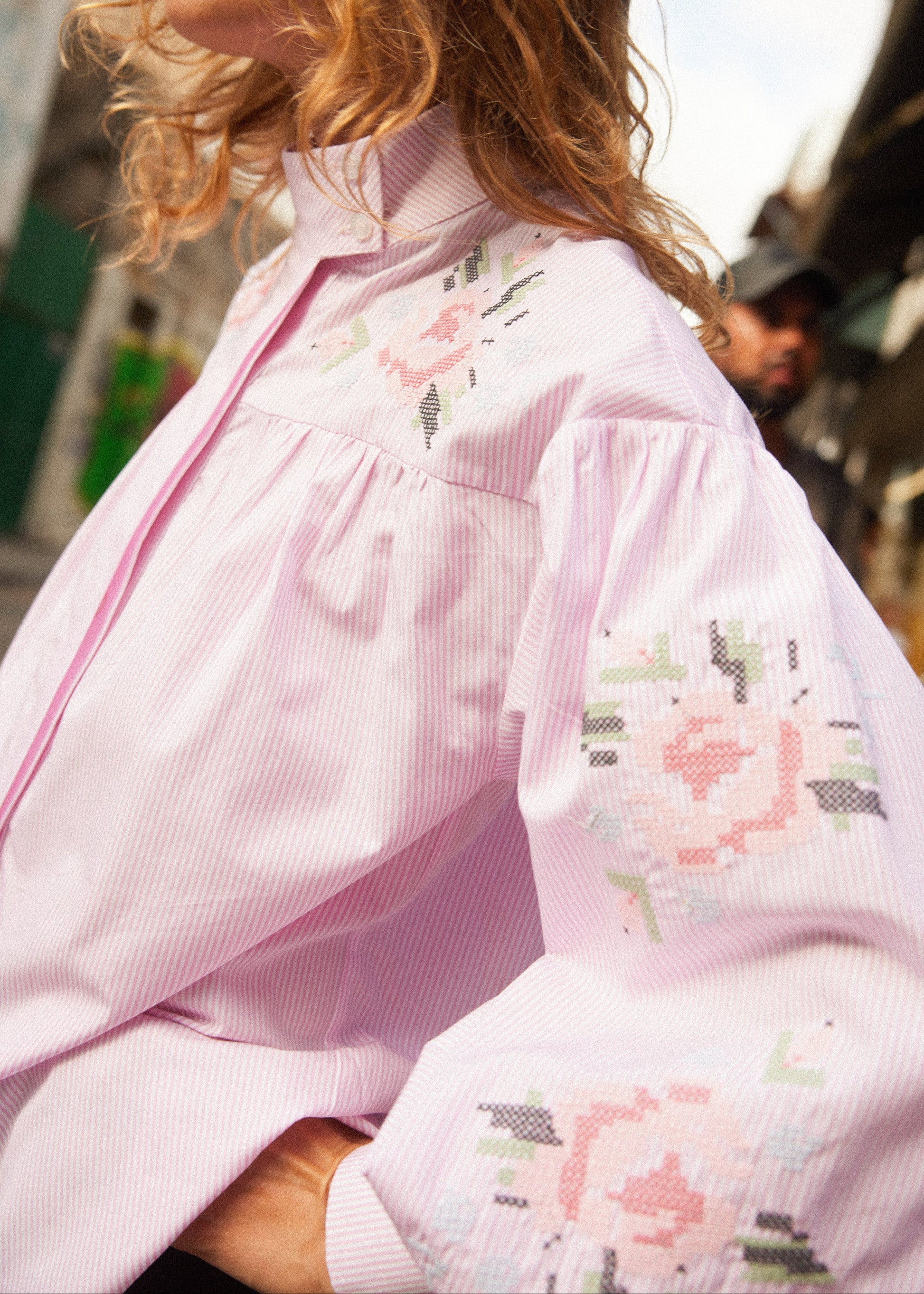 Camisa Lilla de rayas rosa confeccionada en 100% algodón con flores bordadas en pecho y mangas.