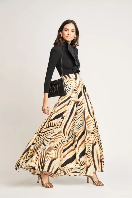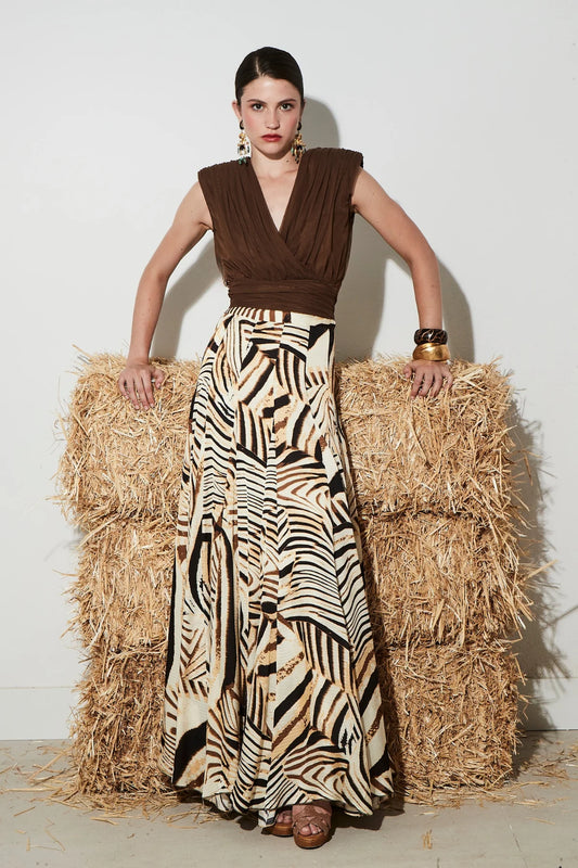 Camisa Lor de tul multiposición en color marrón con escote cruzado y hombreras que realzan la silueta.