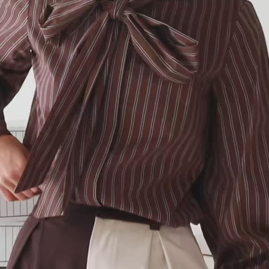 Camisa María diseñada en fondo marrón con rayas rosas y chocolate, aporta un aire elegante y moderno que estiliza la figura.