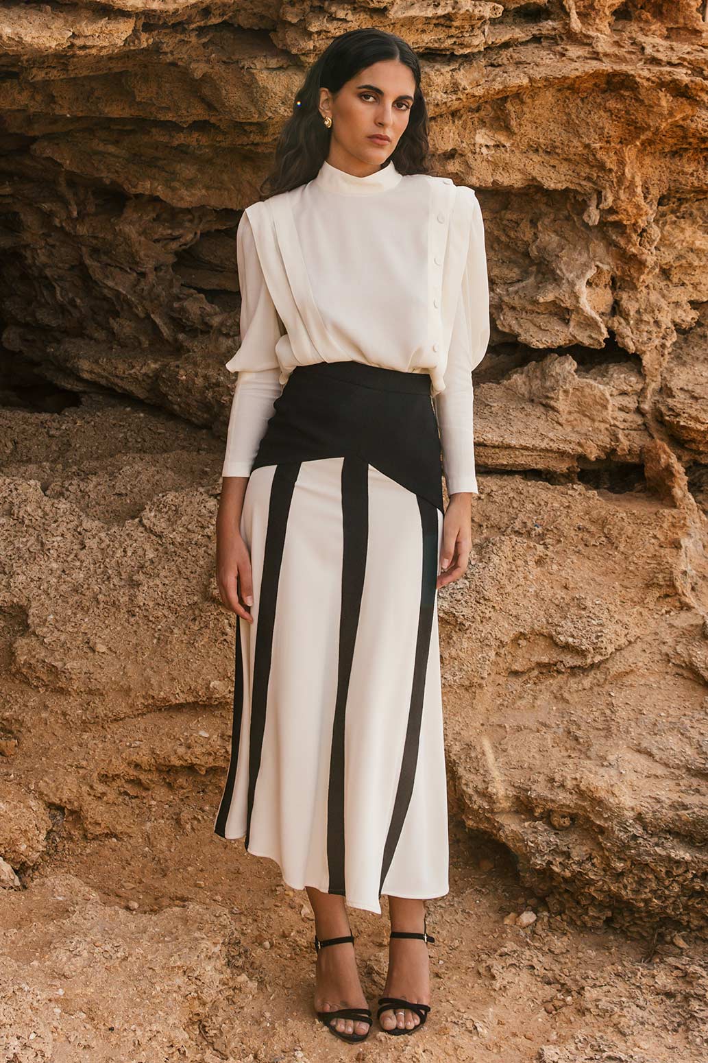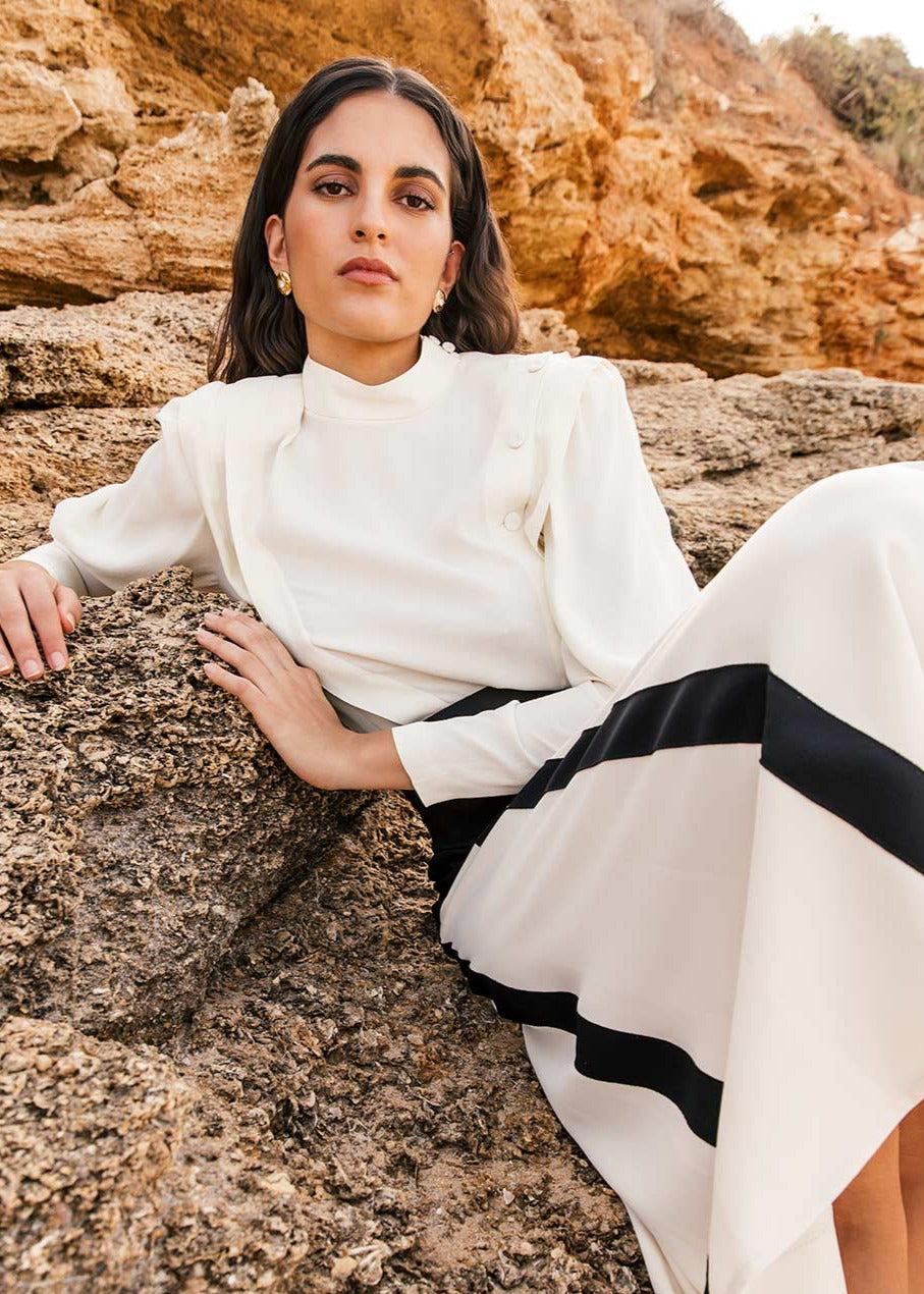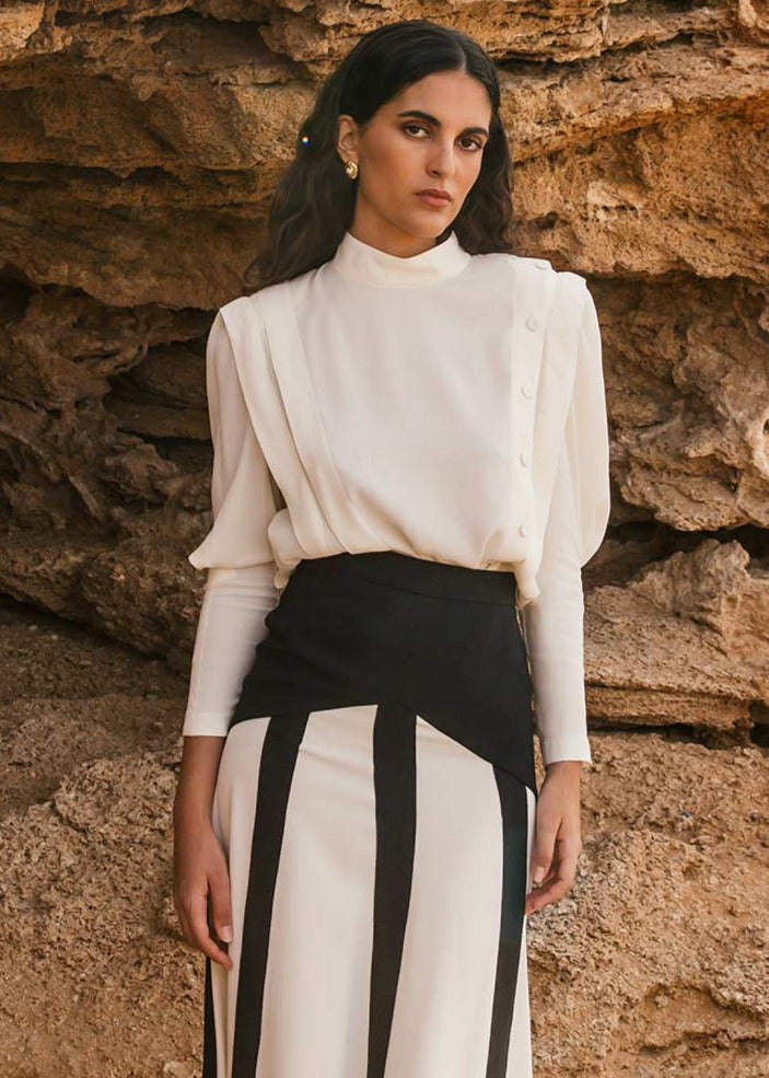 Camisa modelo Mina en crepe de viscosa. Manga larga, cuello alto a la caja, jaretones en delantero y botonadura lateral efecto sastre. Preciosa.