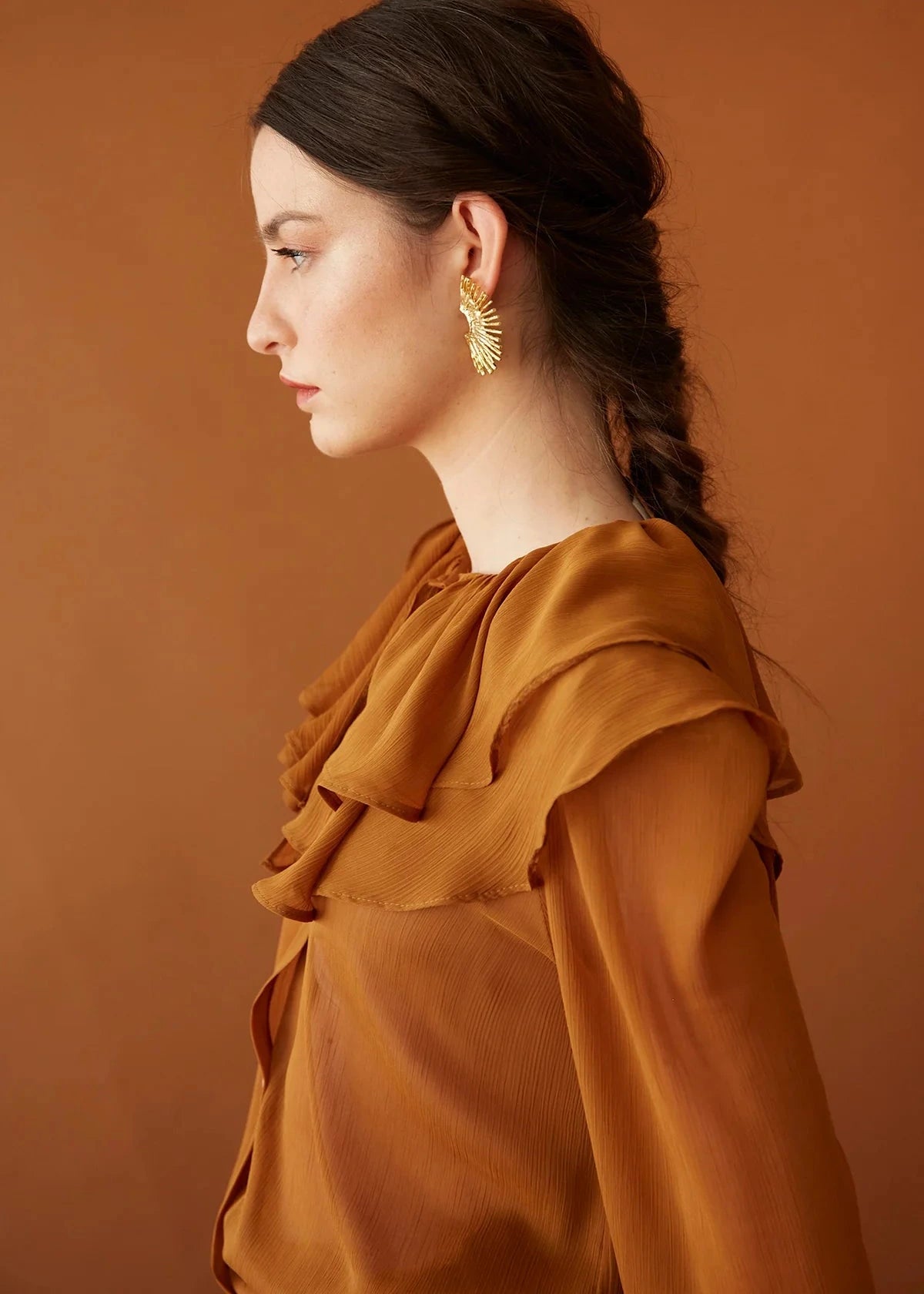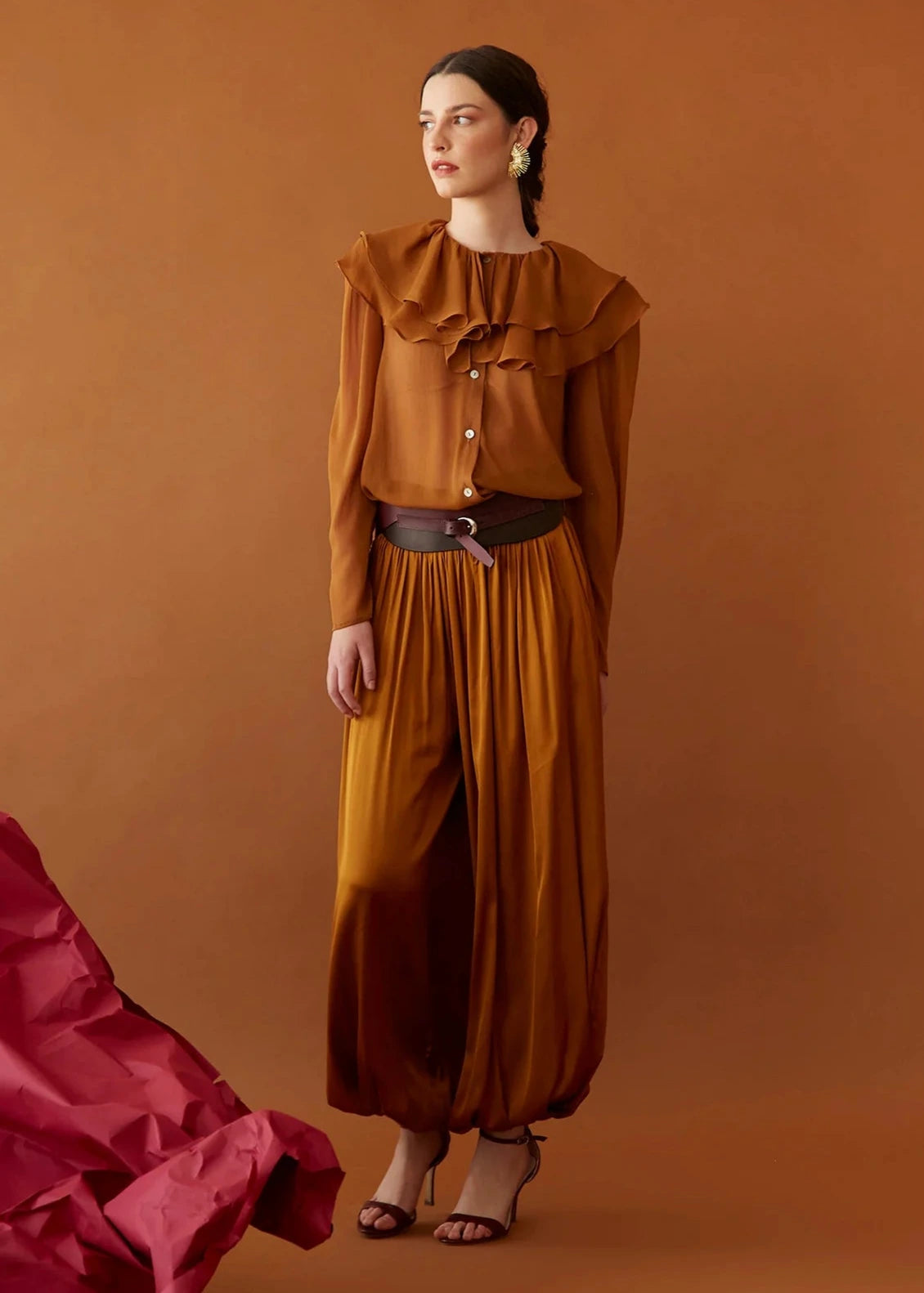 Camisa modelo Nimia. Eleva tu estilo con esta camisa confeccionada en un tejido ligero y vaporoso, presenta volantes en el pecho que aportan un aire romántico y sofisticado.