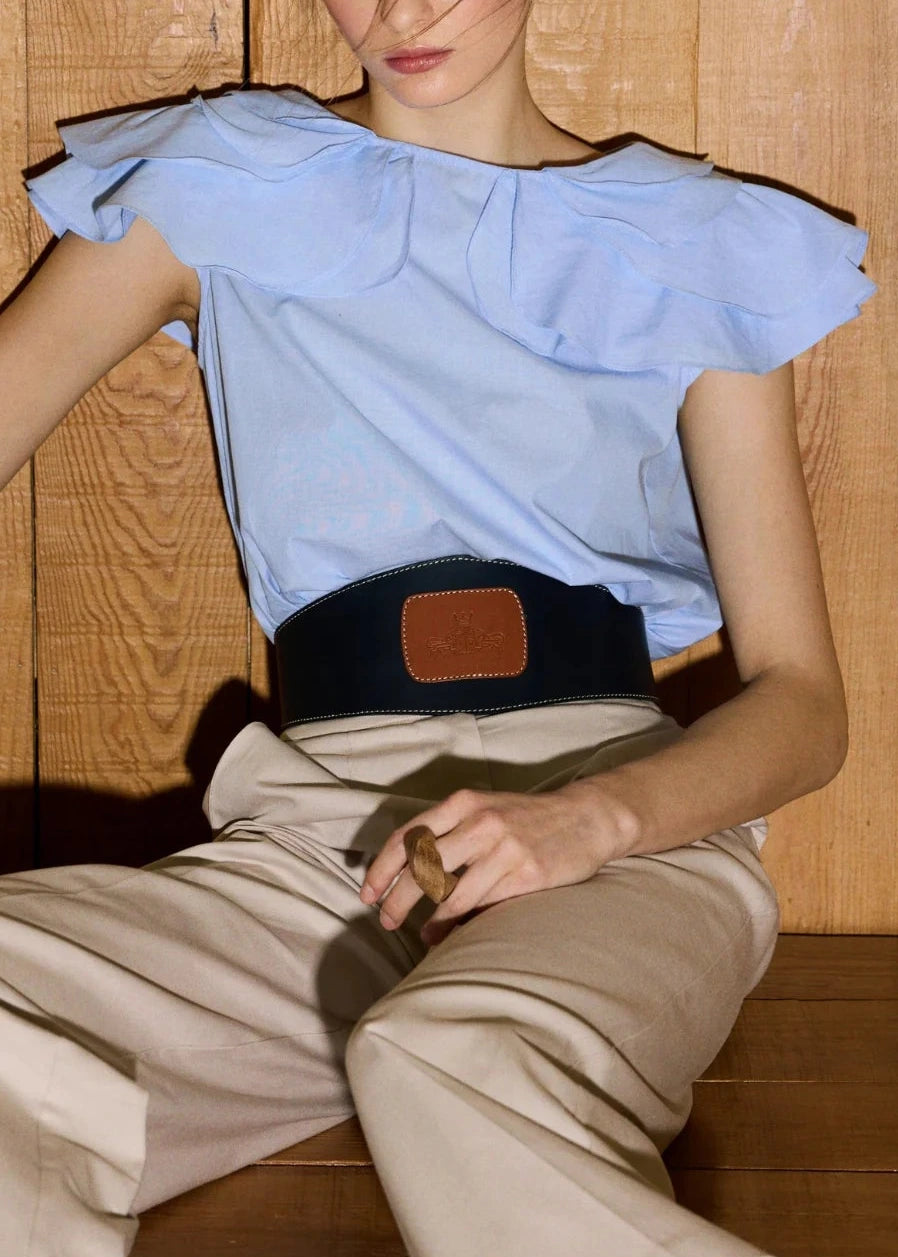 Camisa Siena en color azul con cierre con botones y detalle de volantes en hombros. Muy especial.