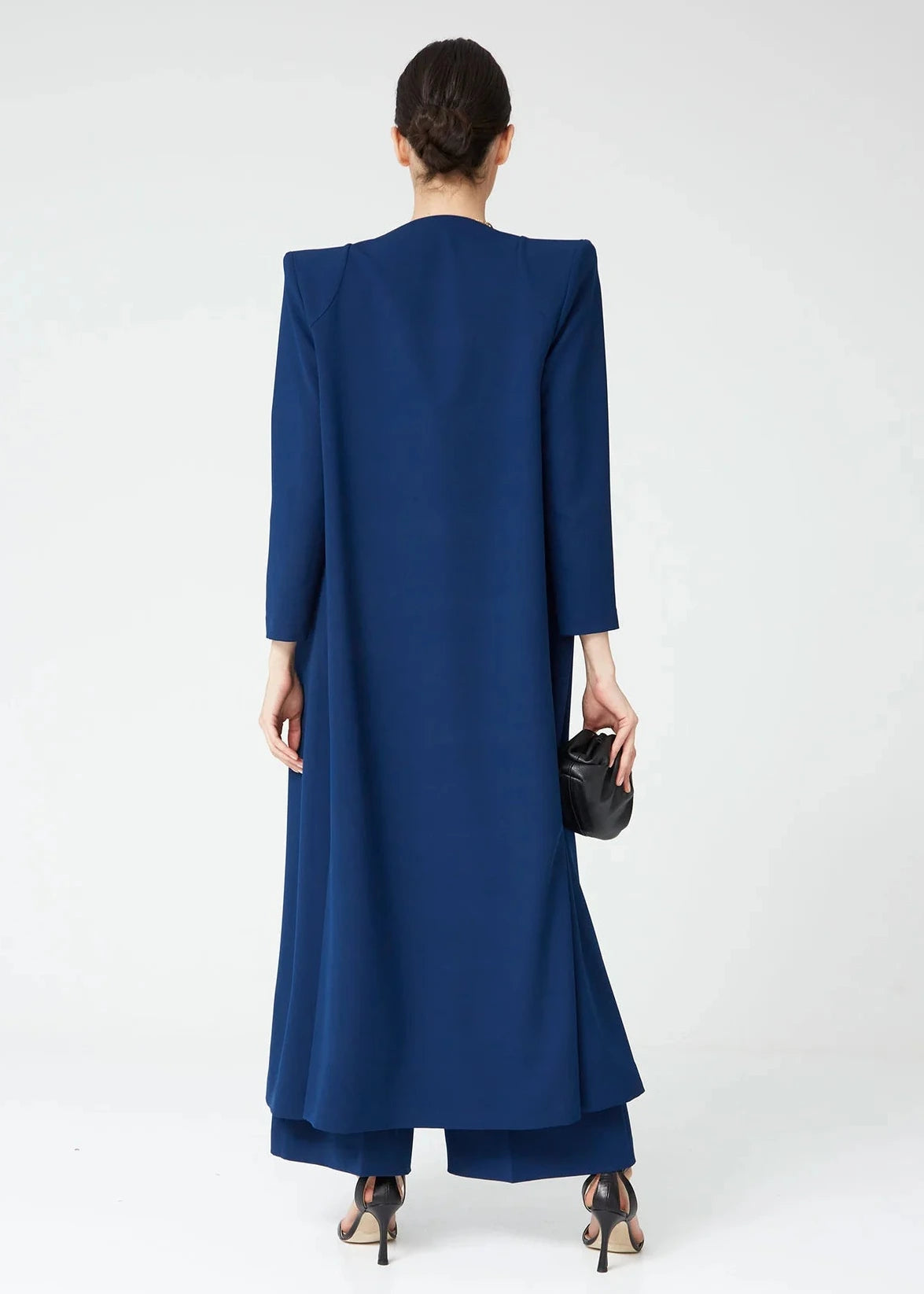 Casaca Gabriela larga azul. Es la prenda perfecta para completar looks de invitada con un aire sofisticado y contemporáneo. Su diseño de líneas limpias y corte recto estiliza la silueta, mientras que los hombros ligeramente estructurados aportan carácter y elegancia al conjunto.