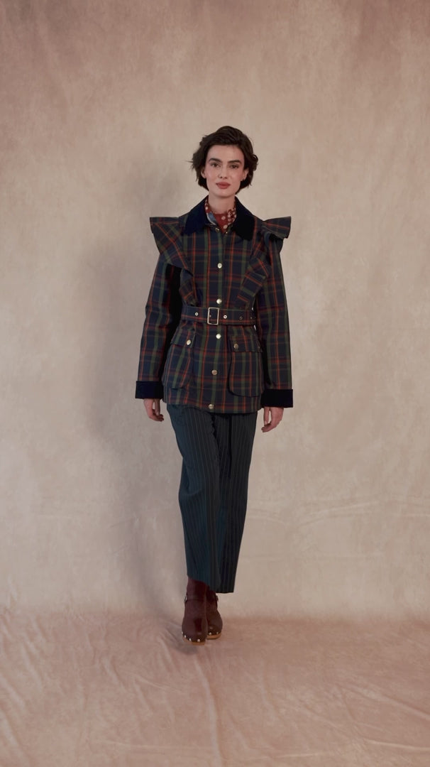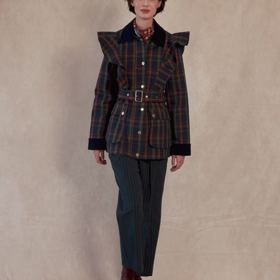 La chaqueta Austen, estilo gabardina, es la prenda que transforma cualquier look en un outfit sofisticado y lleno de estilo. Confeccionada en un favorecedor estampado tartán en tonos verde, azul y rojo, aporta un aire clásico y atemporal, reinterpretado con un diseño moderno y femenino.