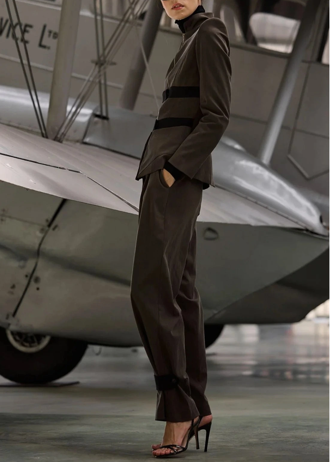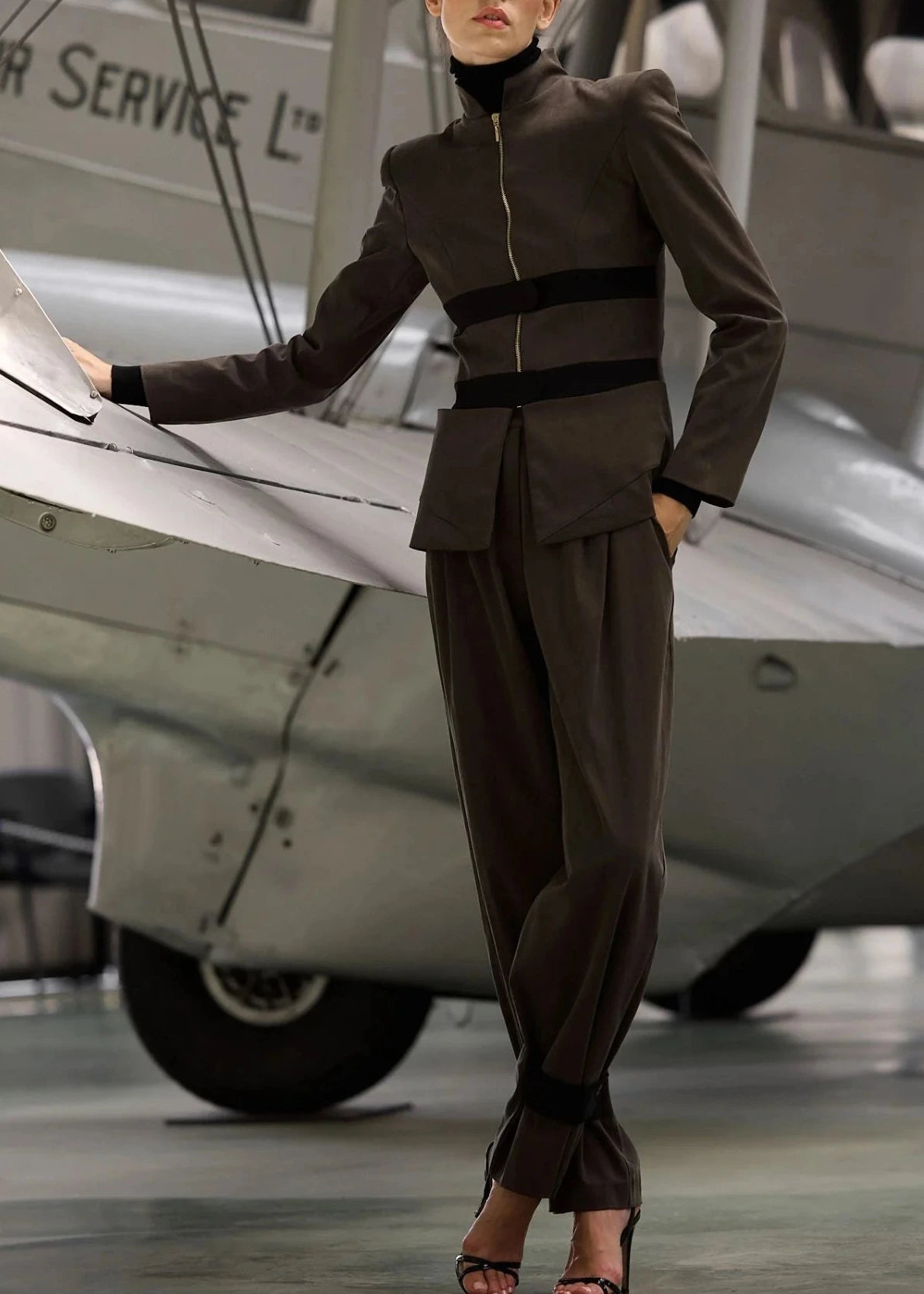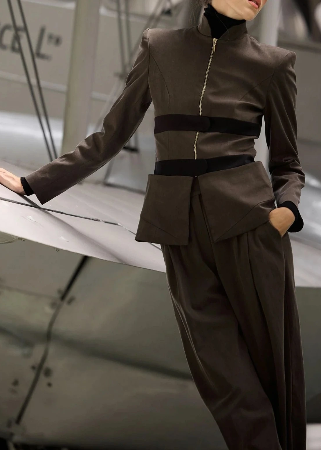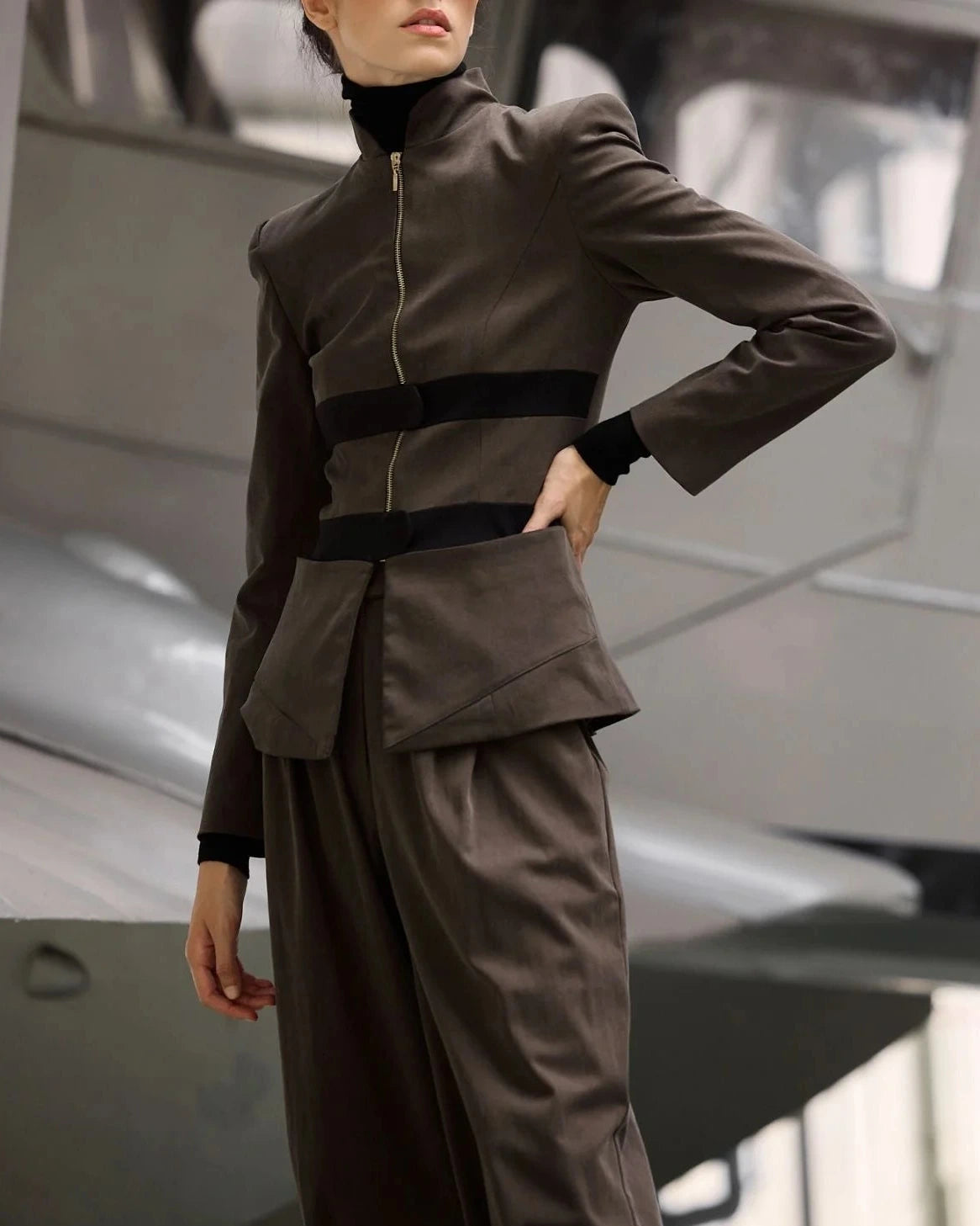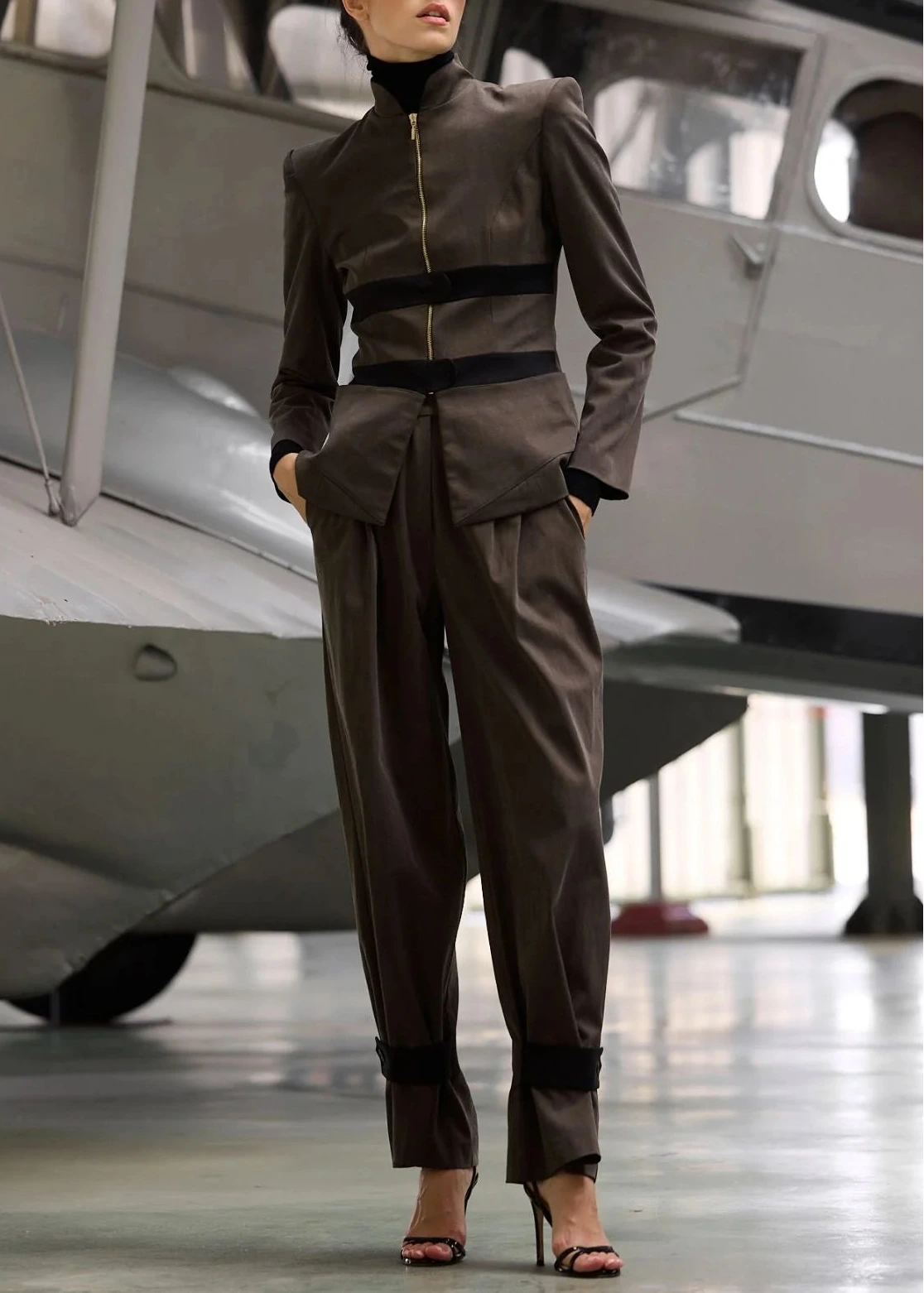 Cierre delantero con cremallera color dorado y cierres superpuestos horizontales en color negro.
