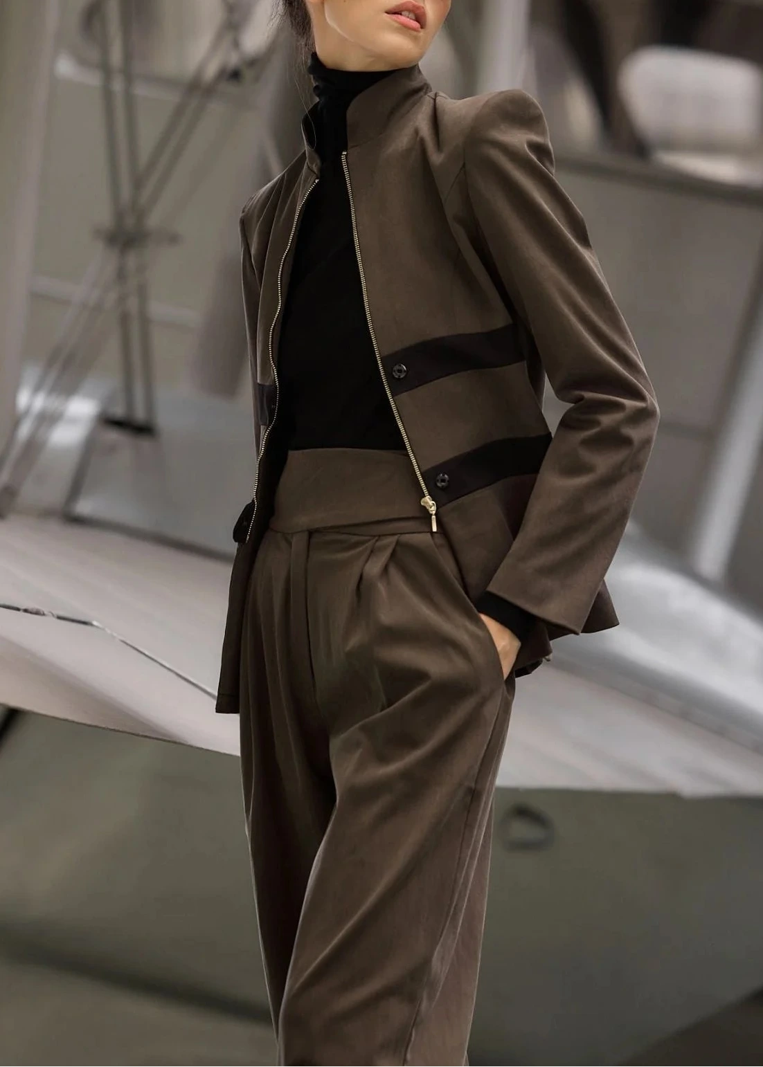 Chaqueta Basa con hombrera marcada y cuello mao abierto en color verde caqui.