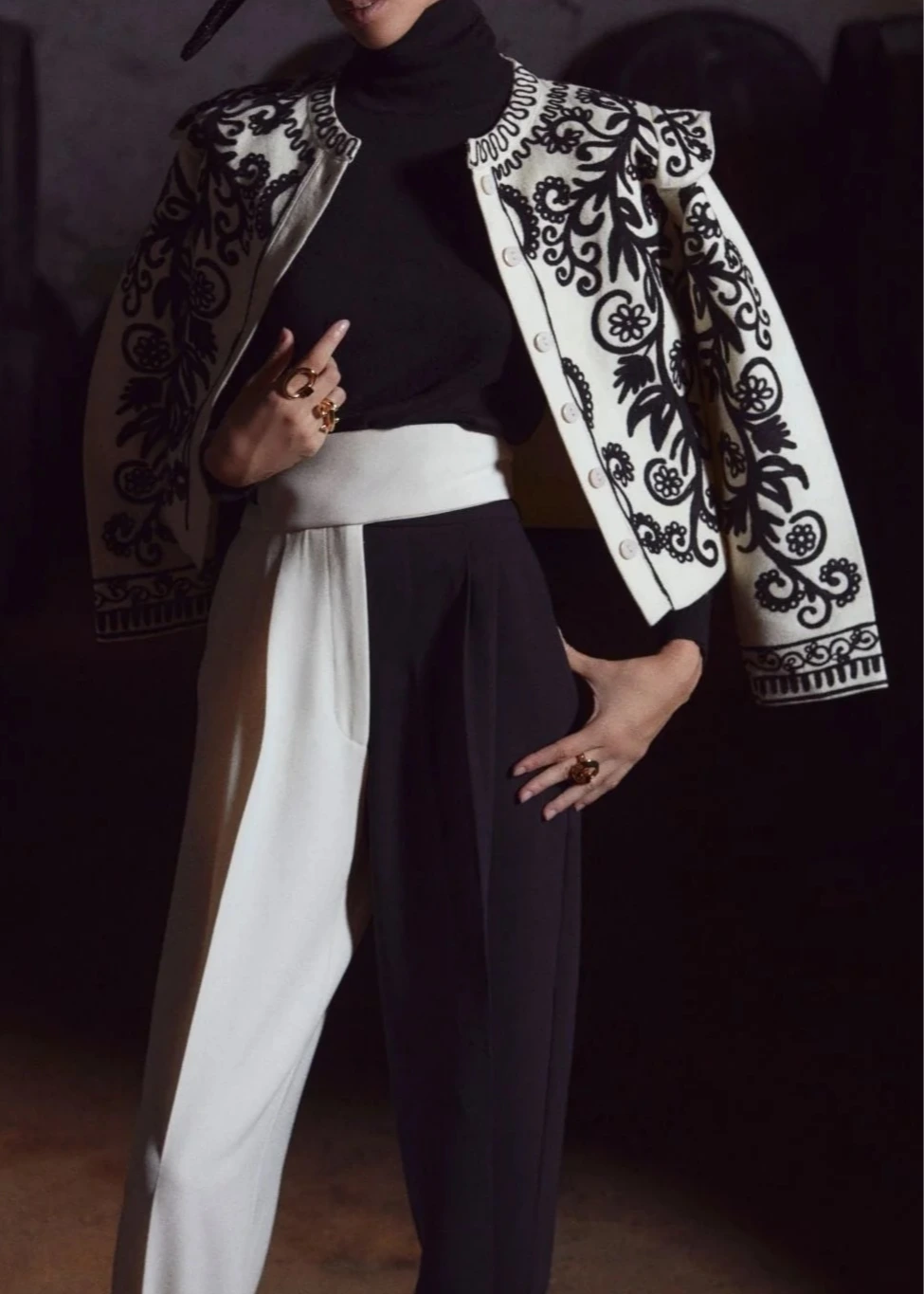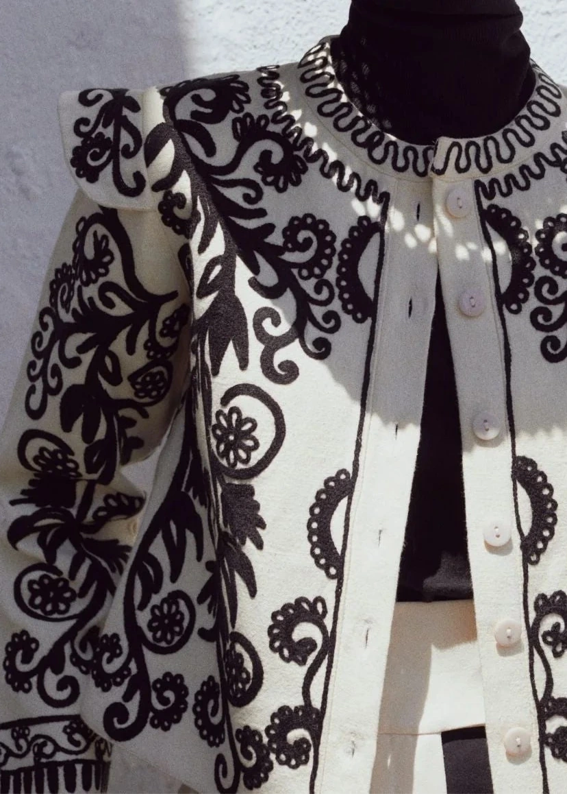 Chaqueta Espe en color blanco roto de algodón bordada de manga larga con estampado floral en negro. Maravillosa.