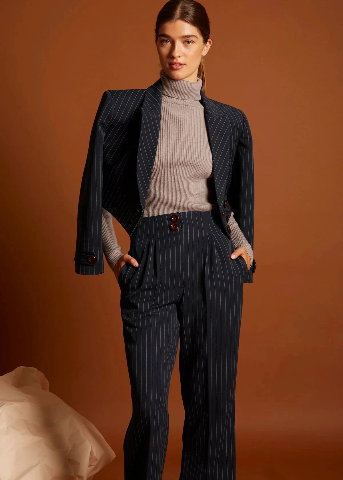 Chaqueta Ghala es una pieza única que reinventa el clásico traje de rayas diplomáticas con un aire moderno y sofisticado.