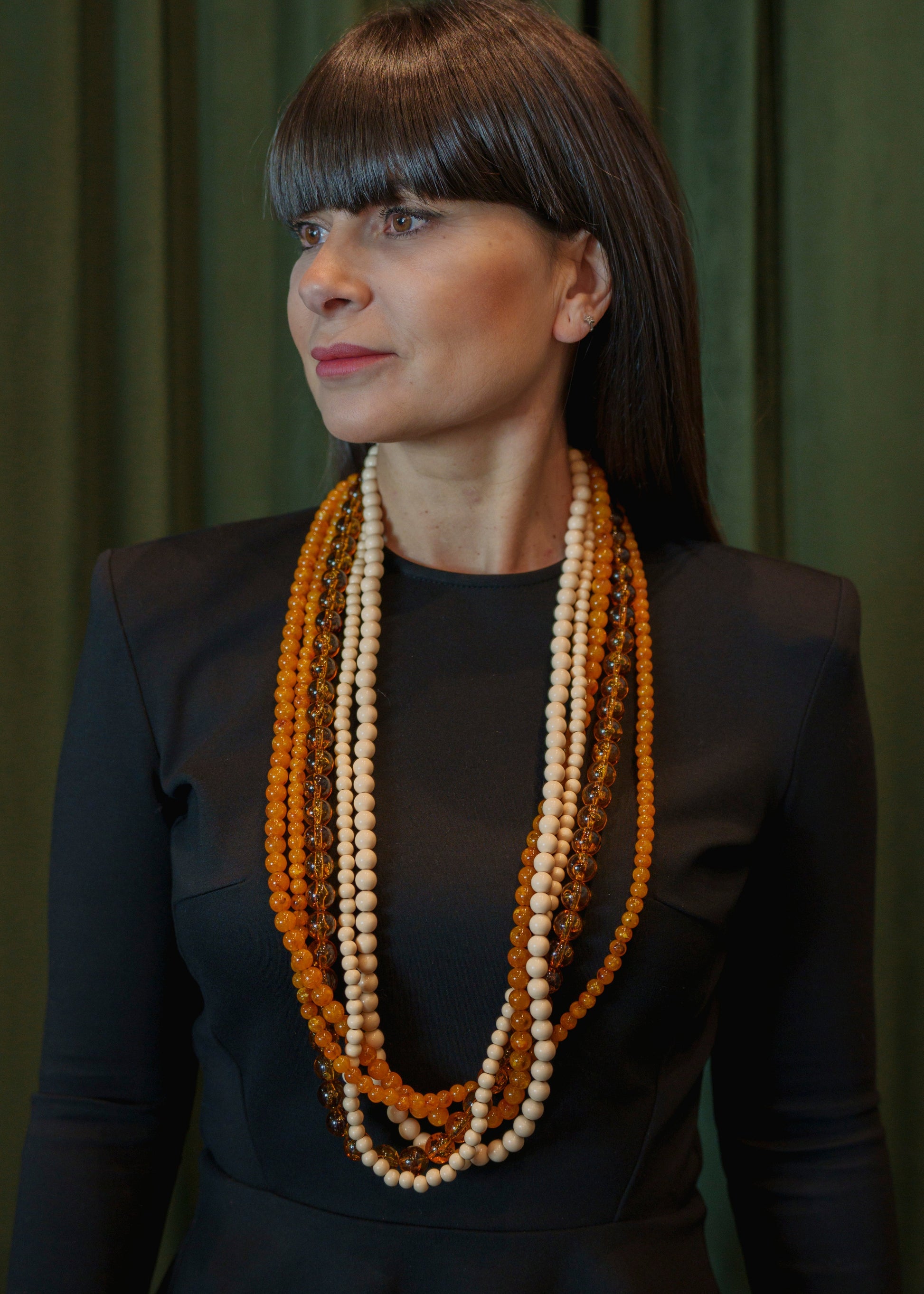 Collar modelo Triana con cinco vueltas con cuentas de calidad en color beige, mostaza y ámbar.