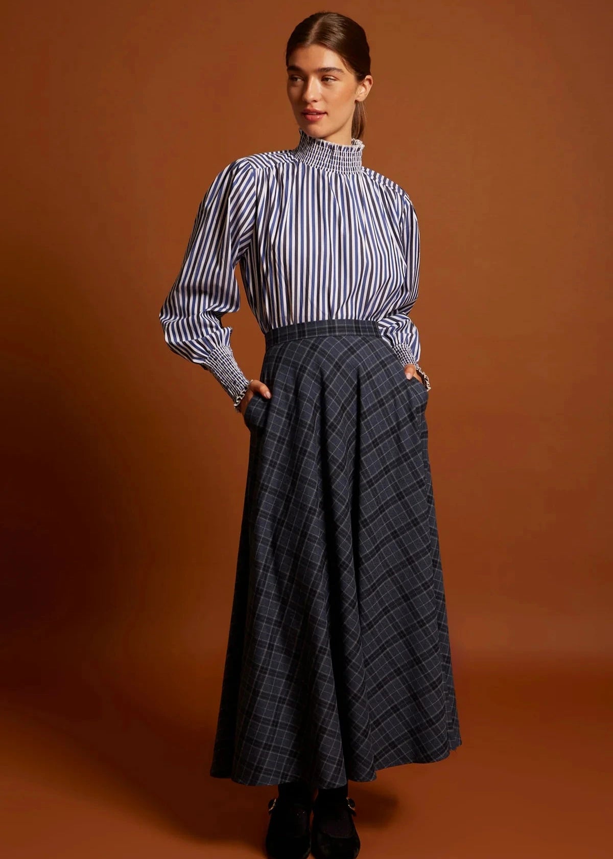 El estampado de cuadros en tonos azul marino la convierte en una pieza atemporal y fácil de combinar con blusas, camisas y jerséis.