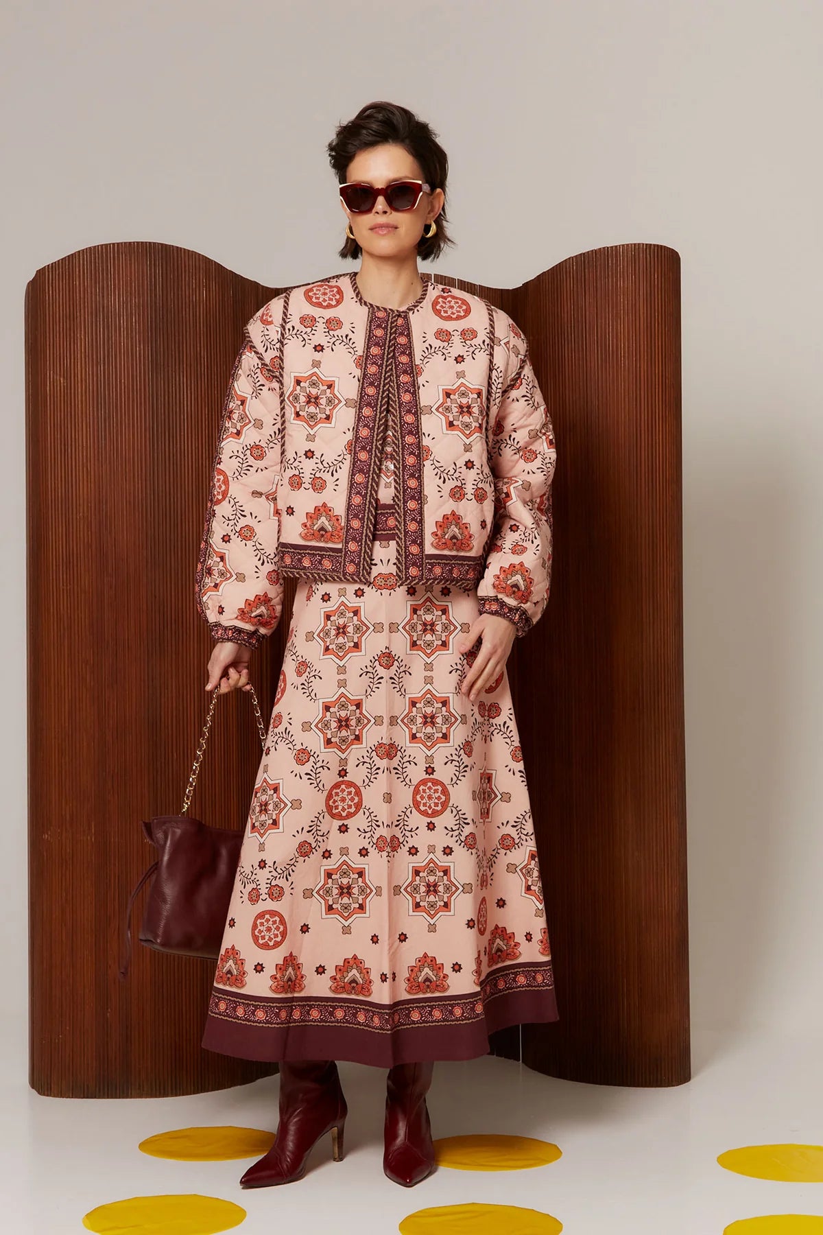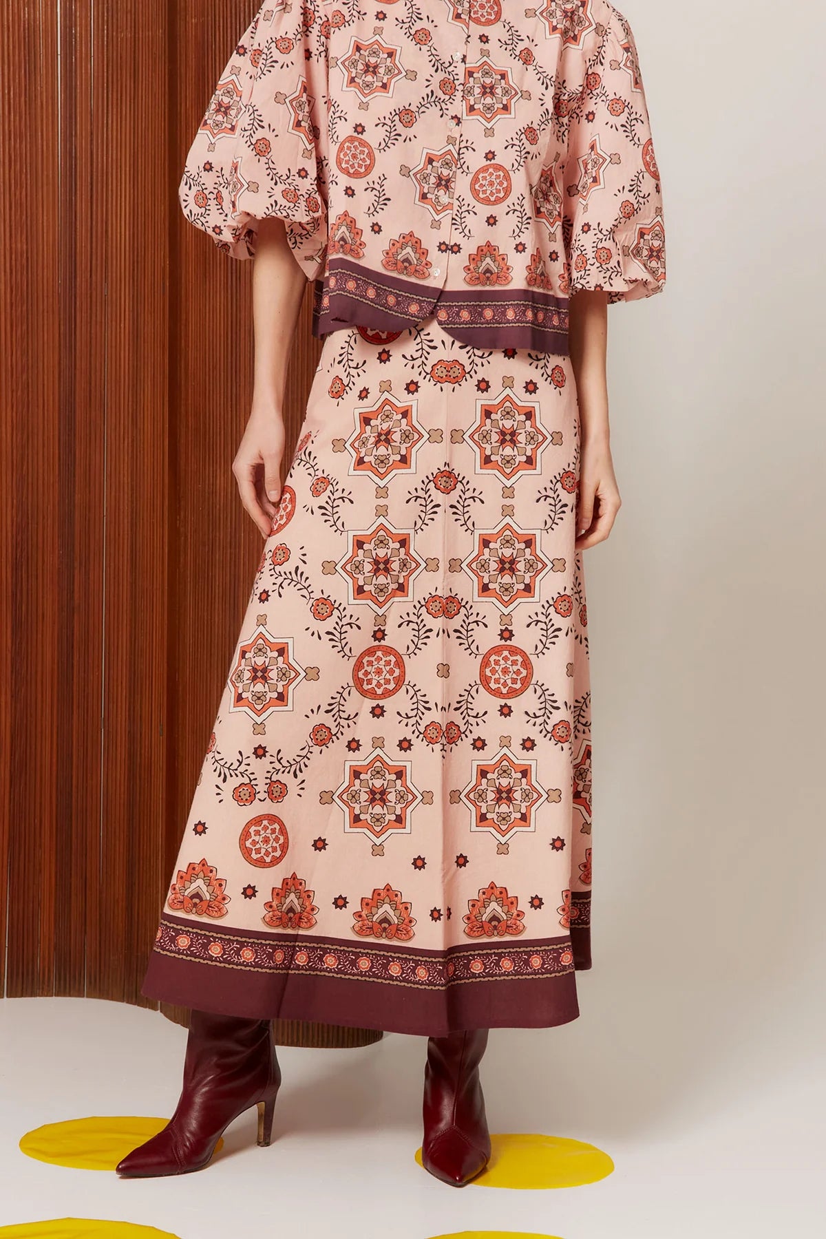 Falda Mosaico es una prenda que combina diseño artístico y elegancia femenina atemporal. Confeccionada en tejido ligero con estampado geométrico mosaico, su base en tonos cálidos crea un efecto visual rico y refinado que aporta personalidad al look.