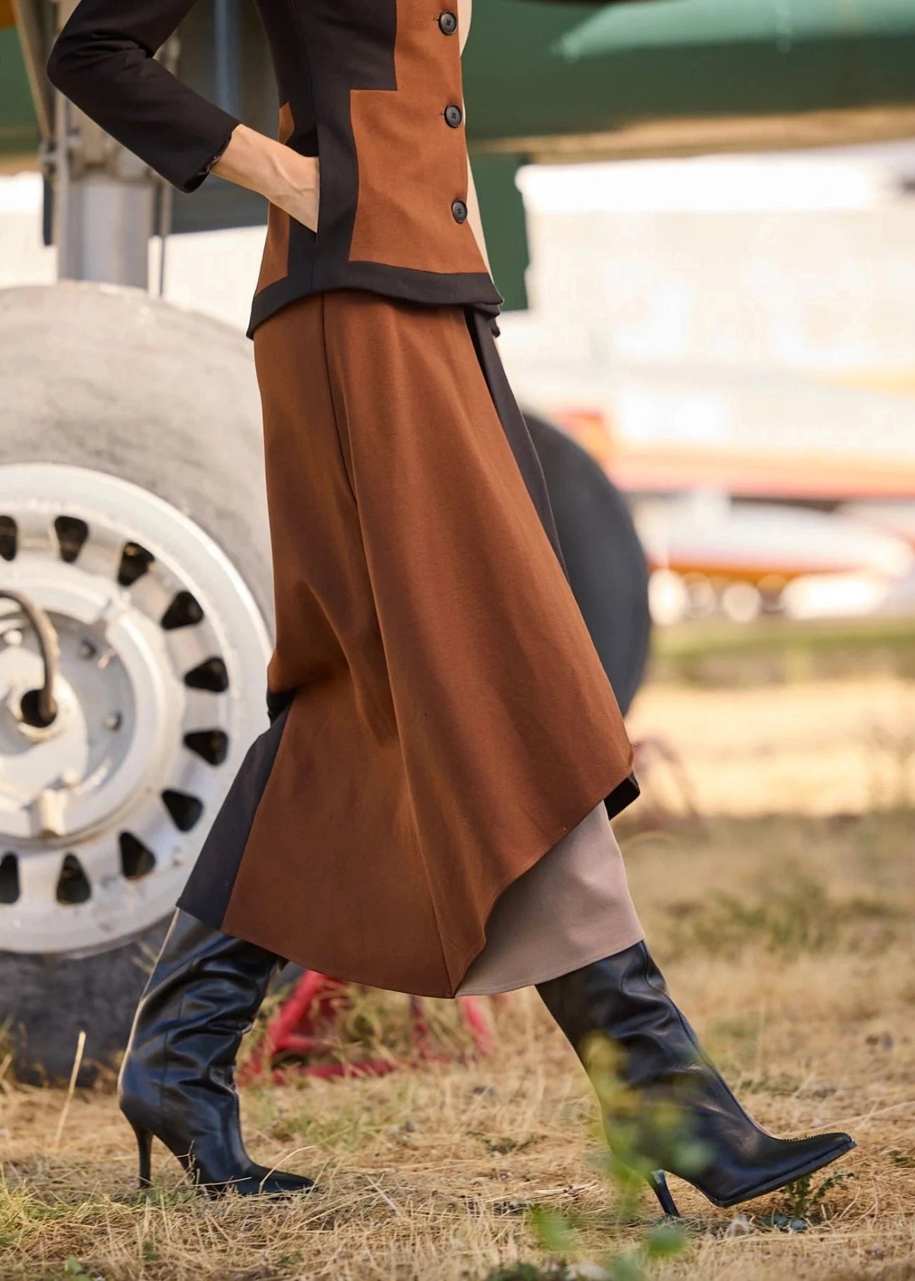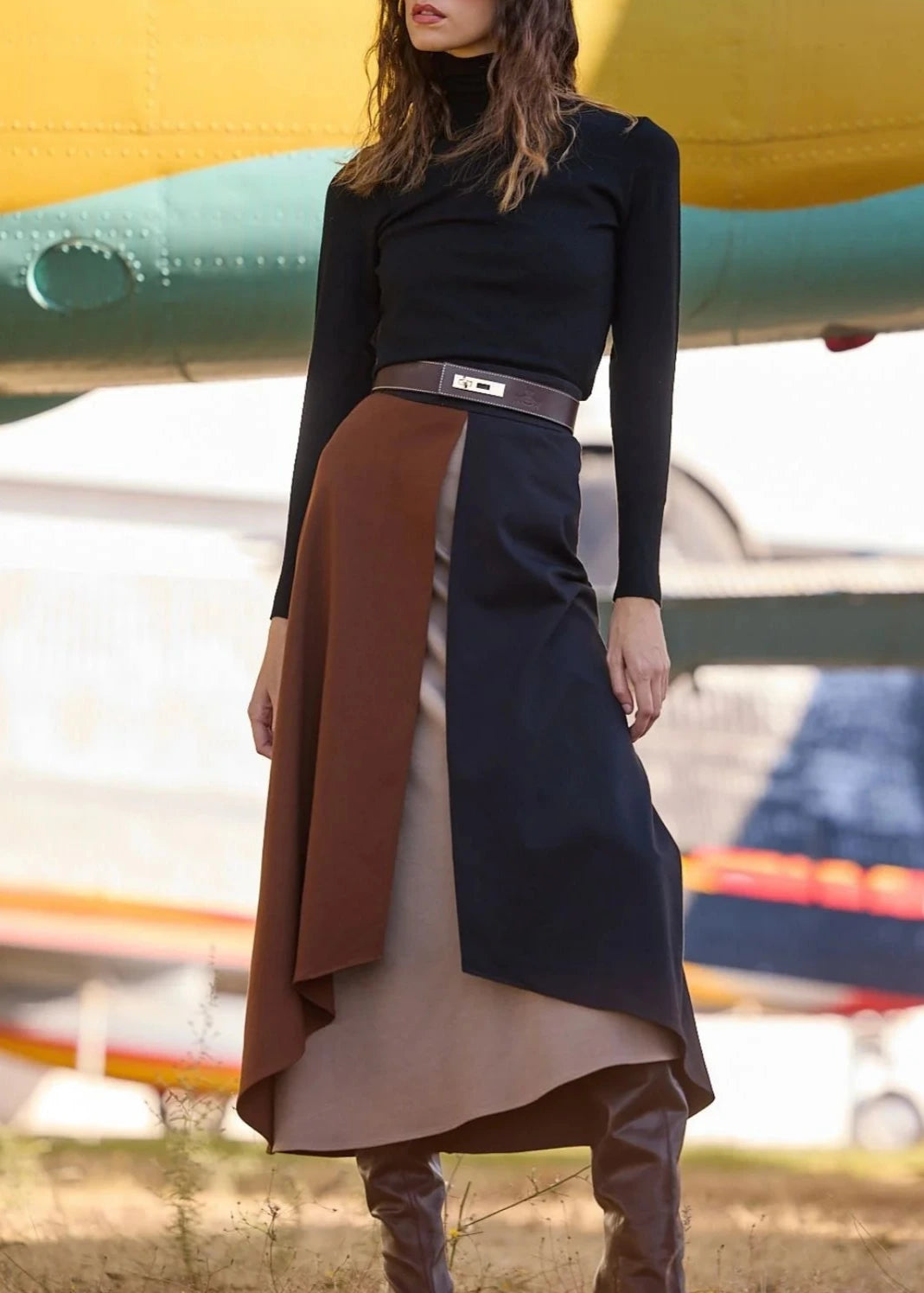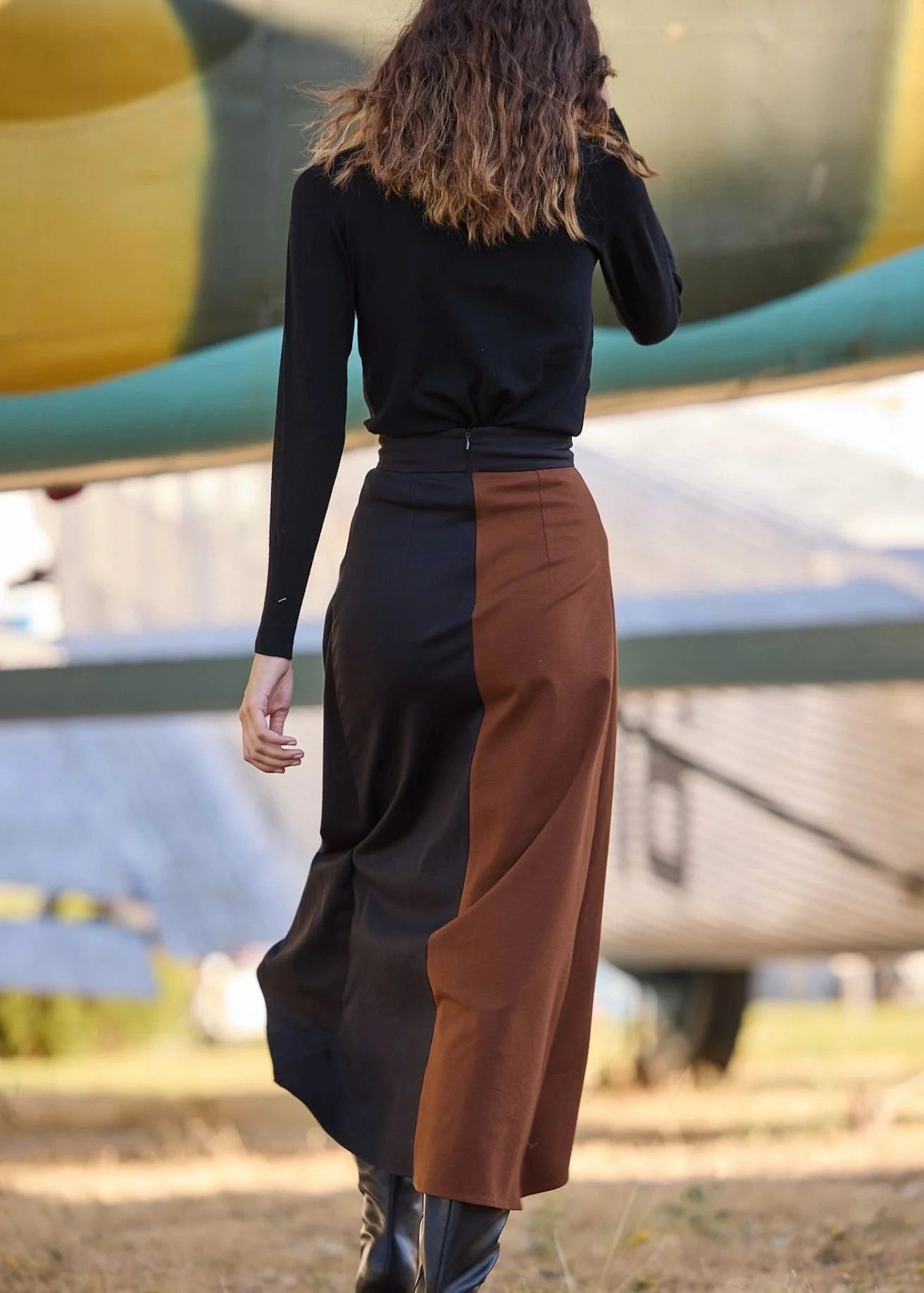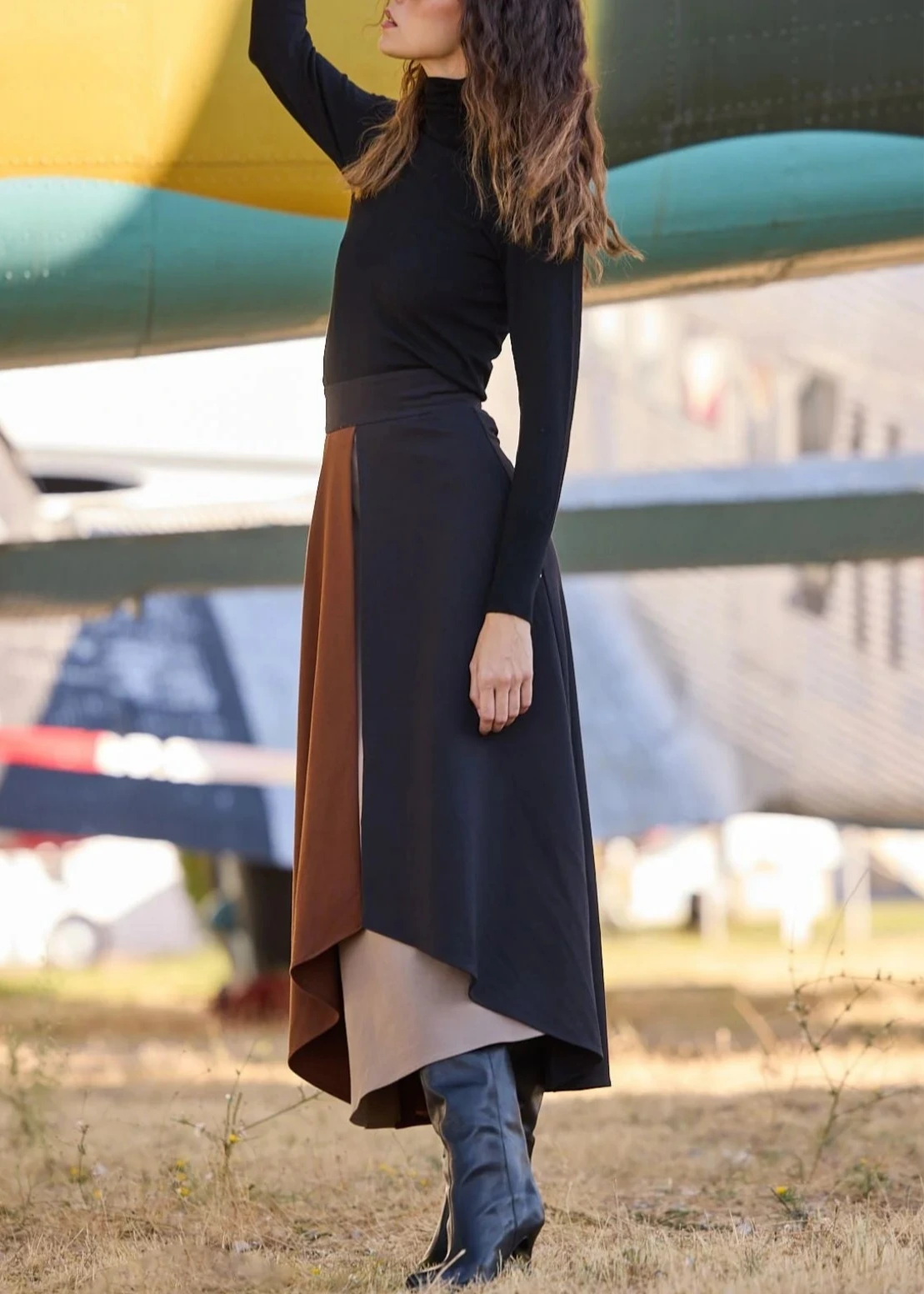 Falda Verónica midi con tejidos superpuestos en color negro, marrón y beige y corte irregular.