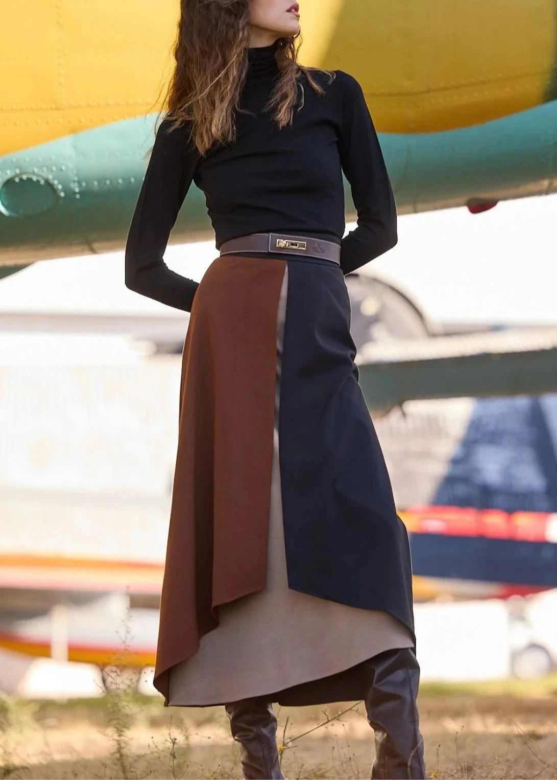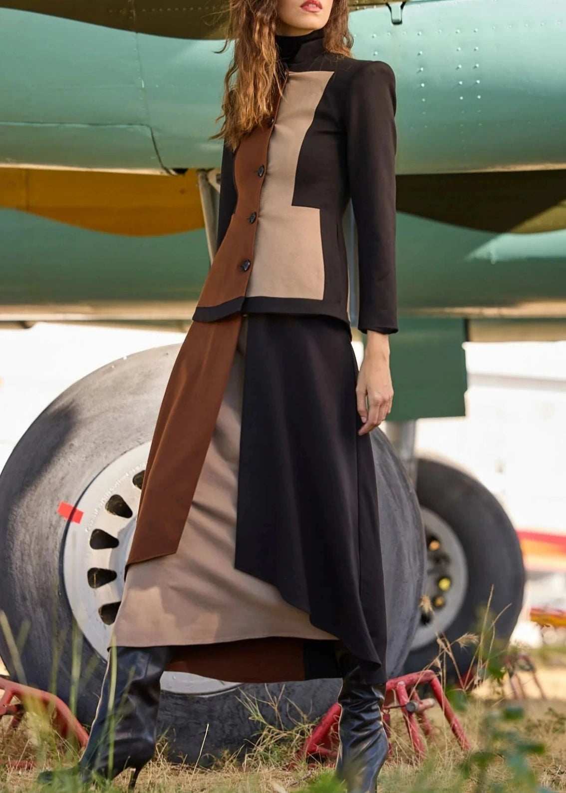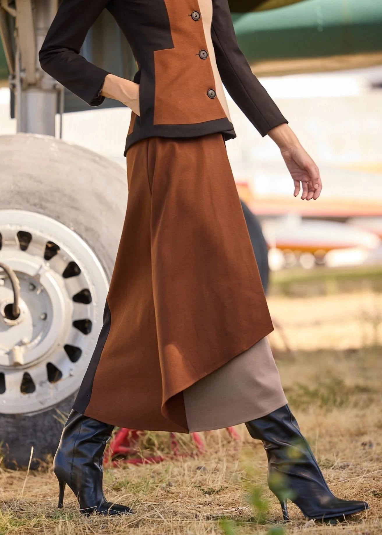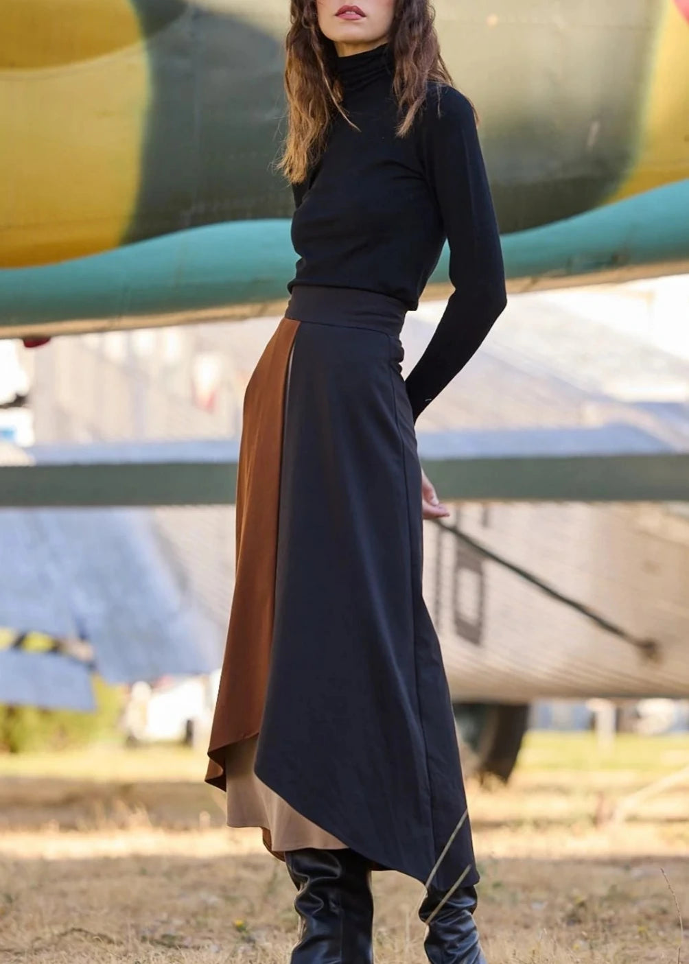 Falda Verónica midi con tejidos superpuestos en color negro, marrón y beige y corte irregular.