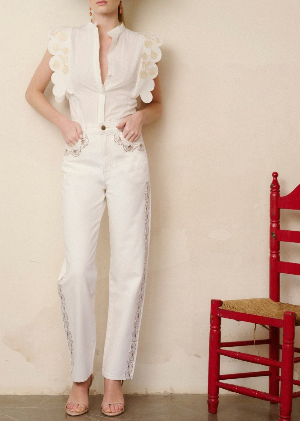 Jeans modelo Esencia en color blanco con detalle de bordado en beige en los laterales.