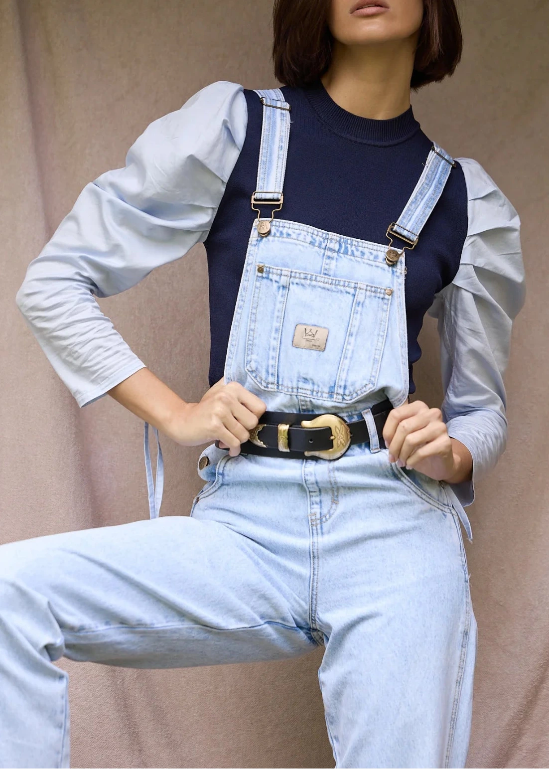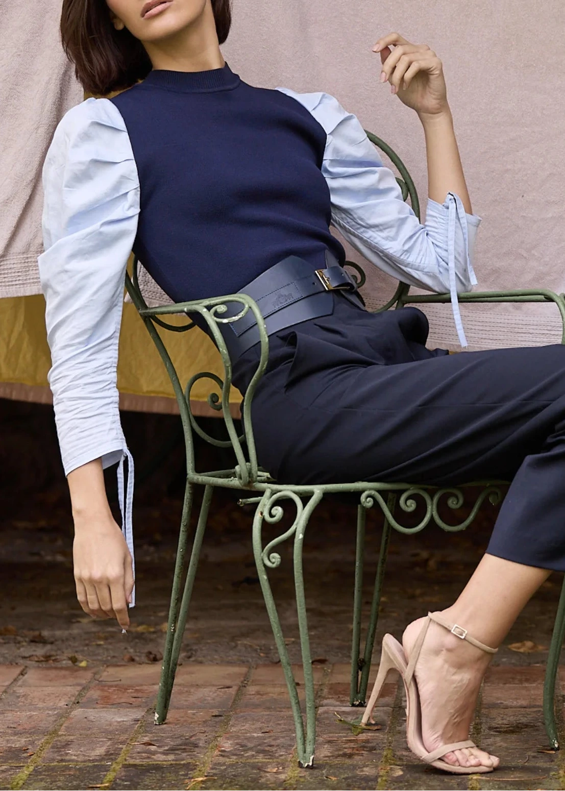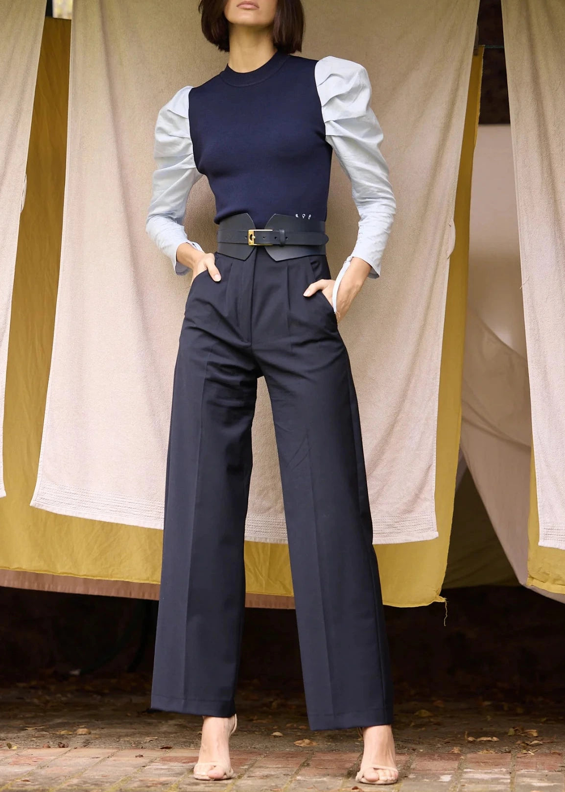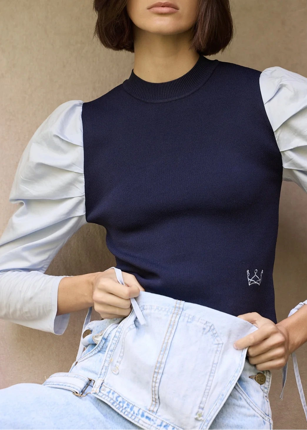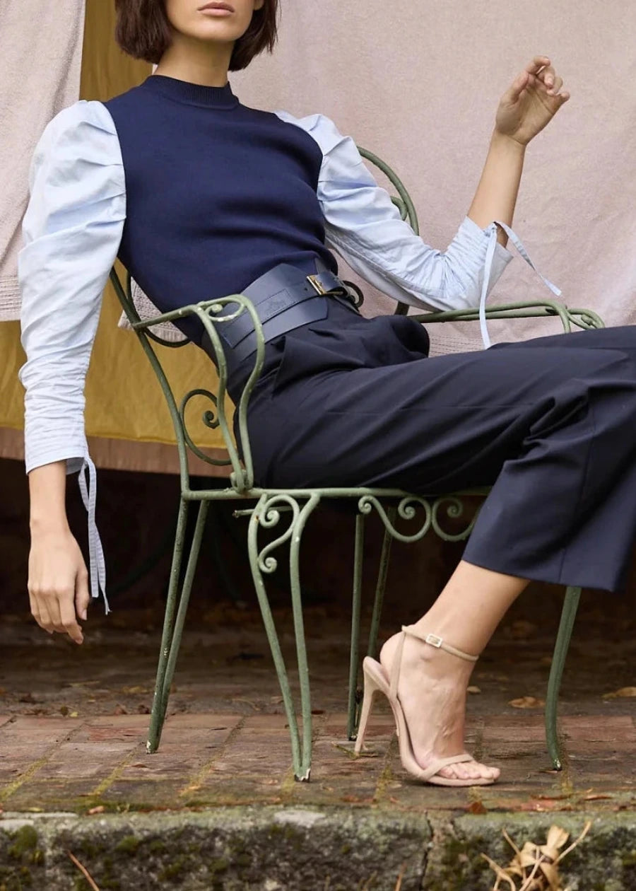 Jersey Adela de color azul marino con manga abullonada de camisa en color azul claro y detalle fruncido en manga.