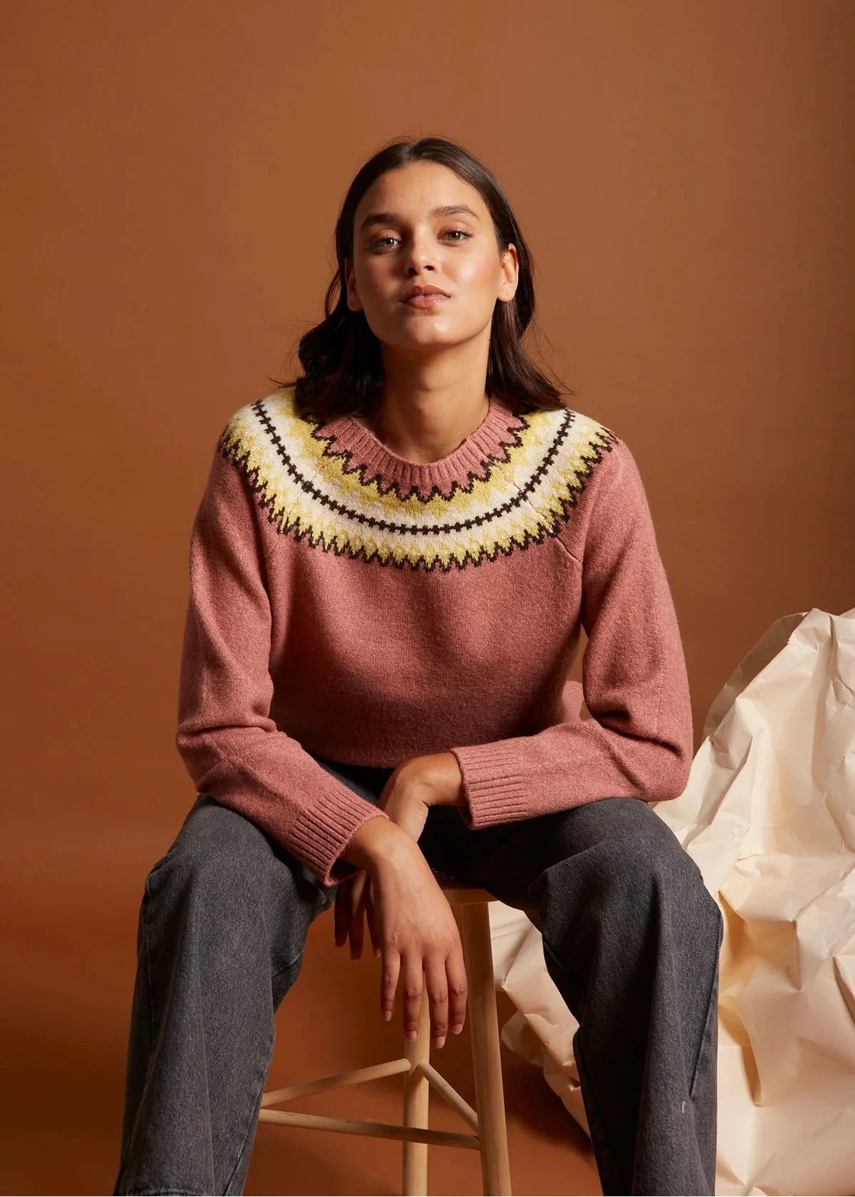 Jersey modelo Greca rosa. Aporta un aire cálido y femenino a tus estilismos de invierno con este jersey rosa de punto con diseño de grecas en contraste.