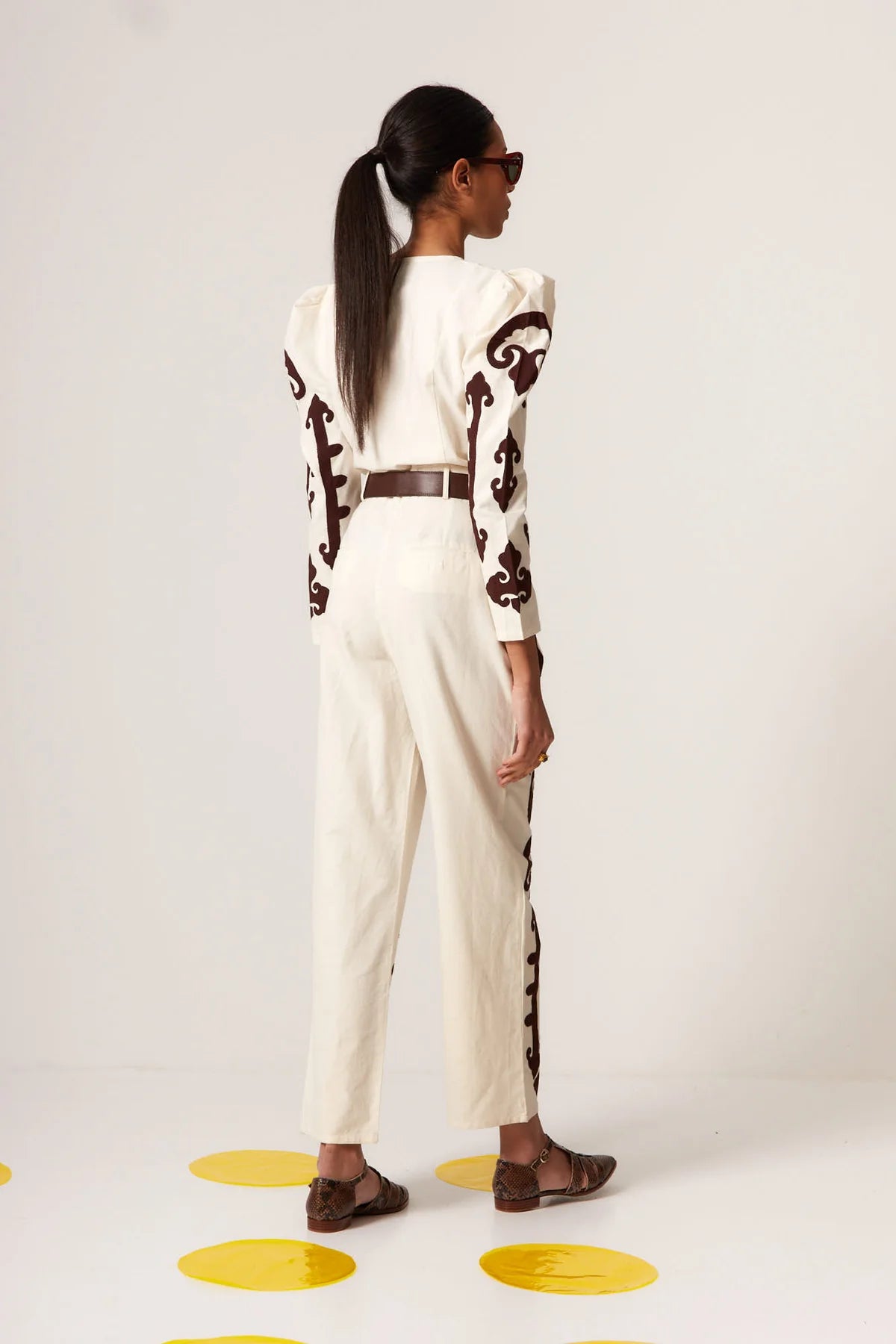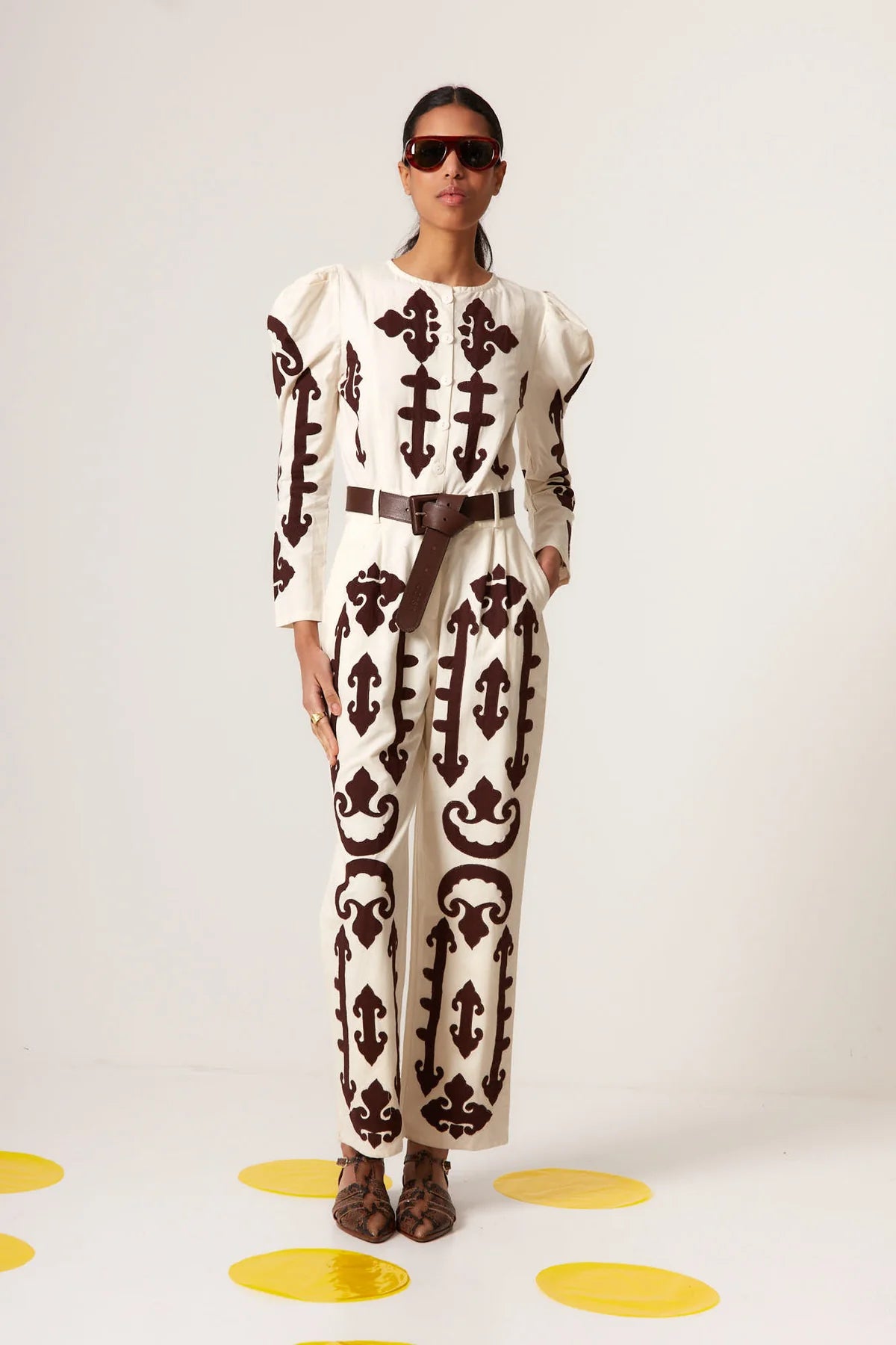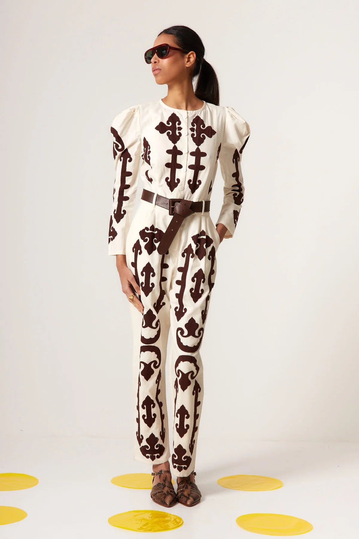 Mono Amalfi crudo con estampado marrón, una prenda sofisticada que combina carácter, diseño y feminidad en una silueta elegante y contemporánea.