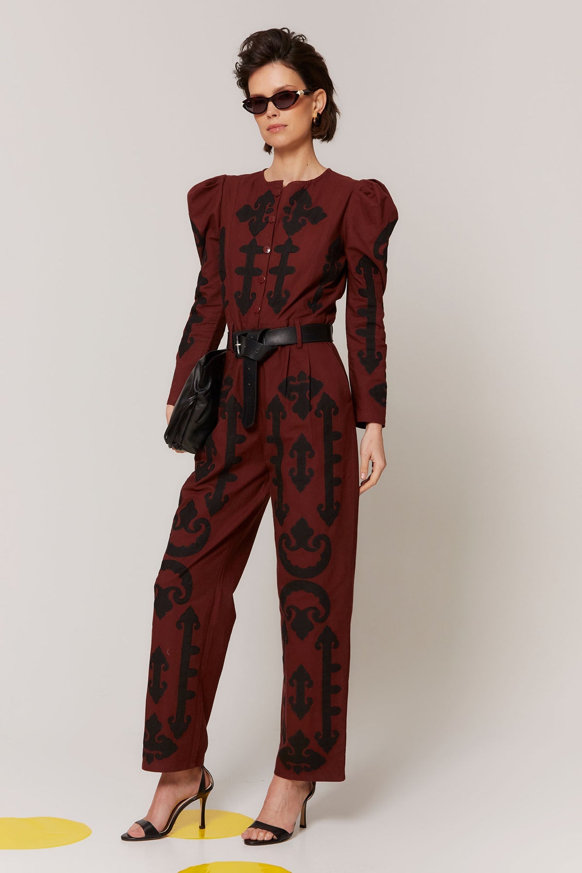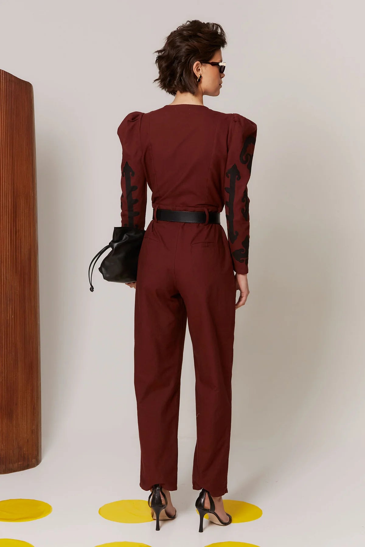 Mono Amalfi granate estampado, una prenda sofisticada que combina carácter, diseño y feminidad en una silueta elegante y contemporánea.