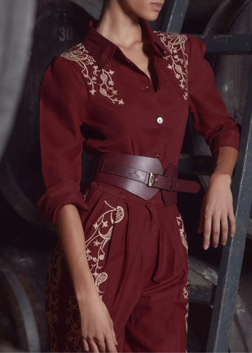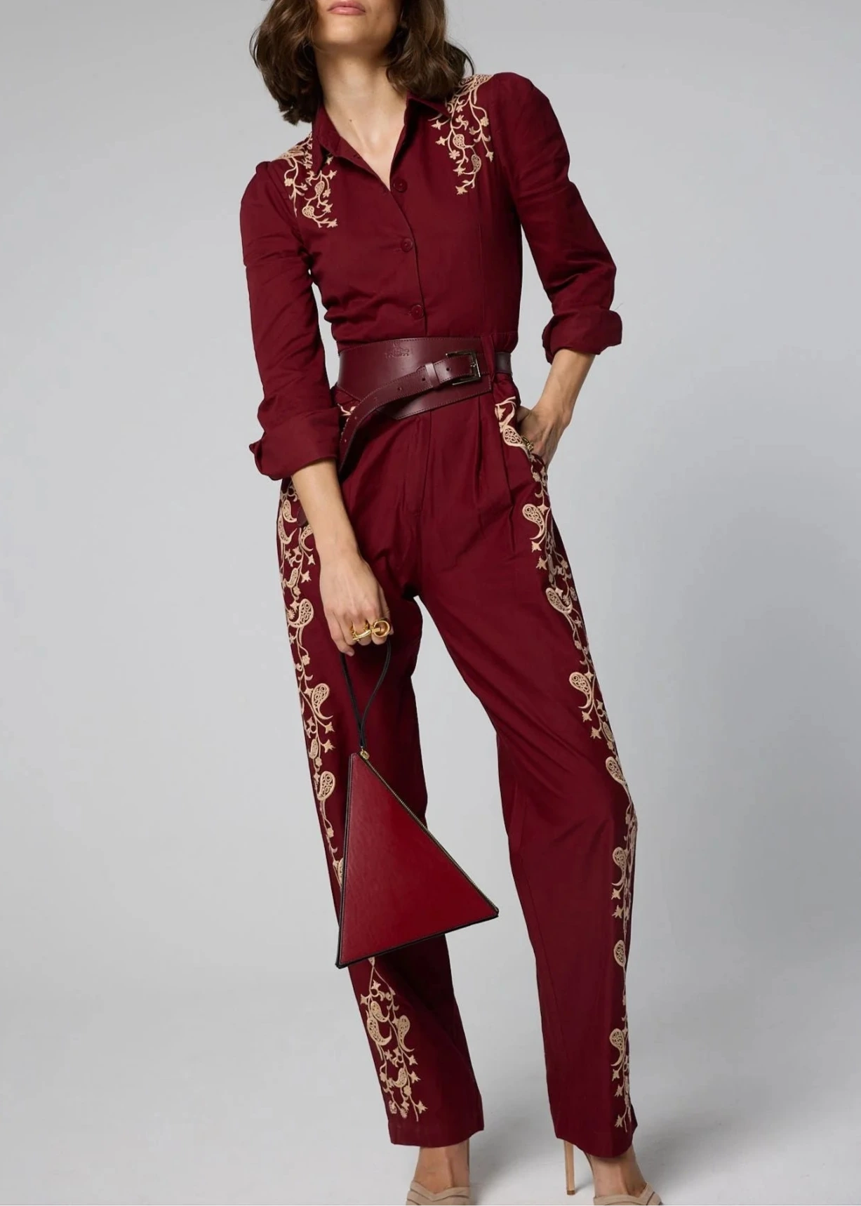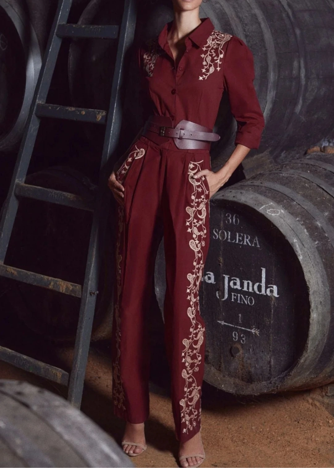 Mono Bare largo de color burdeos con bordados en color beige. Nos enamora.