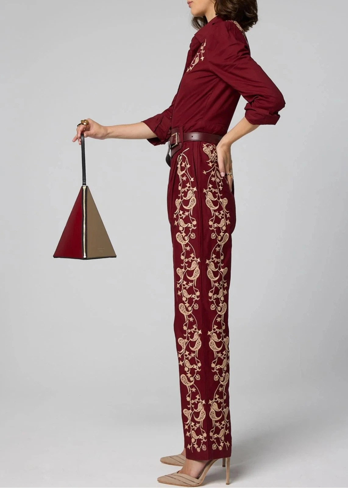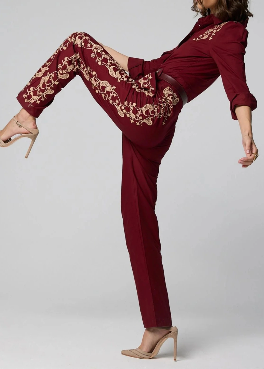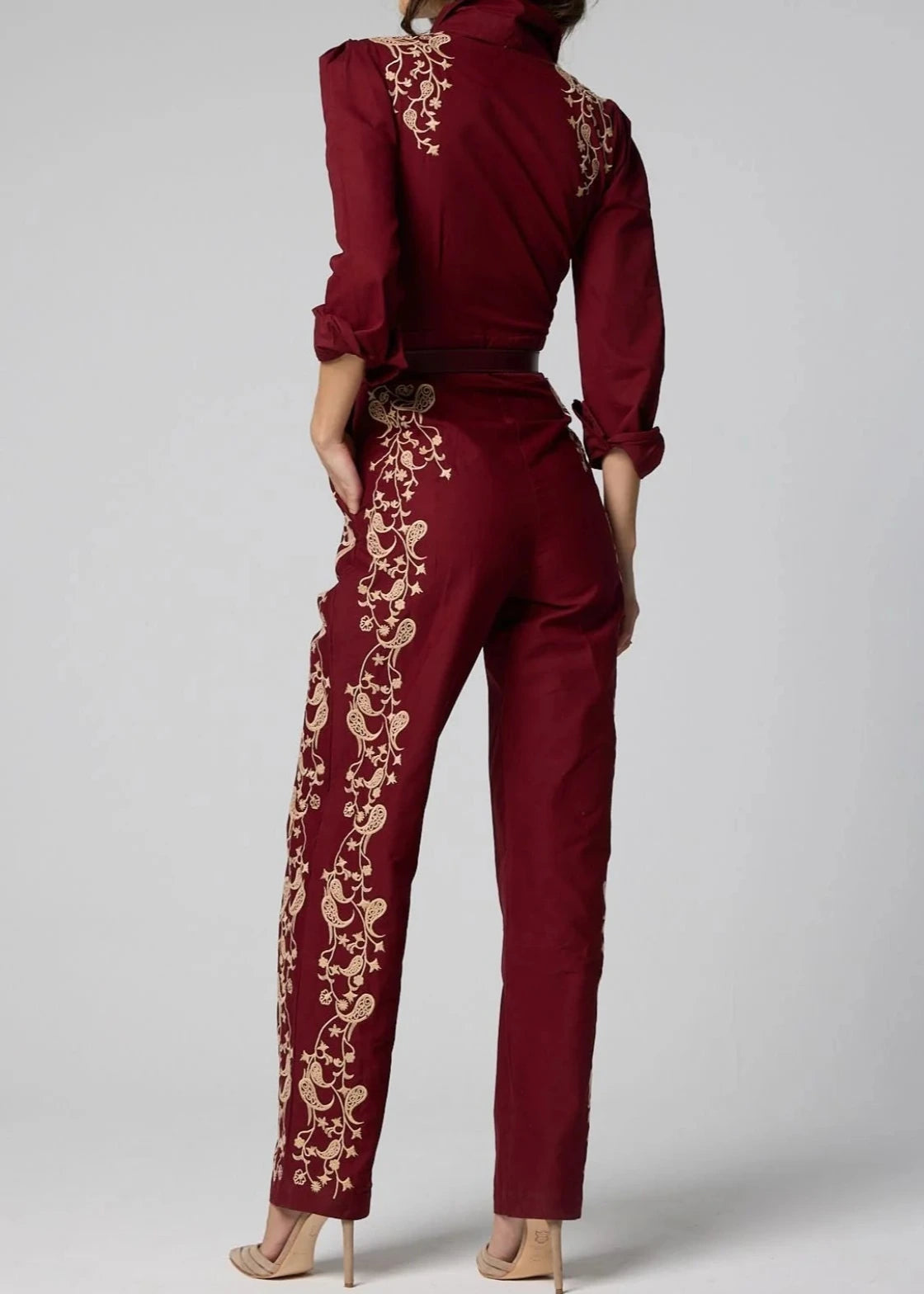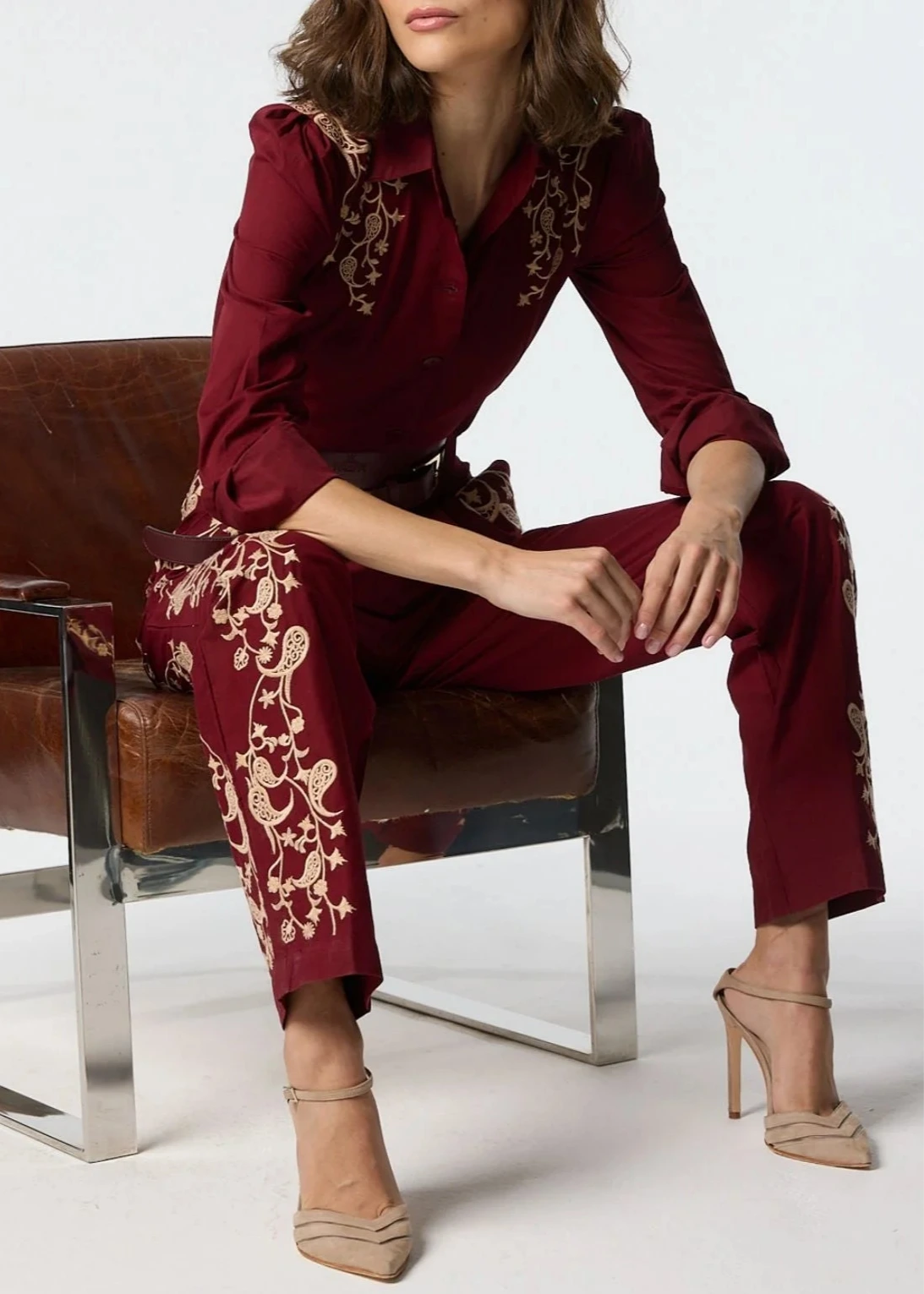 Mono Bare largo de color burdeos con bordados en color beige. Nos enamora.