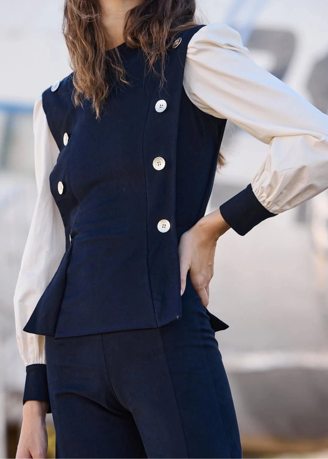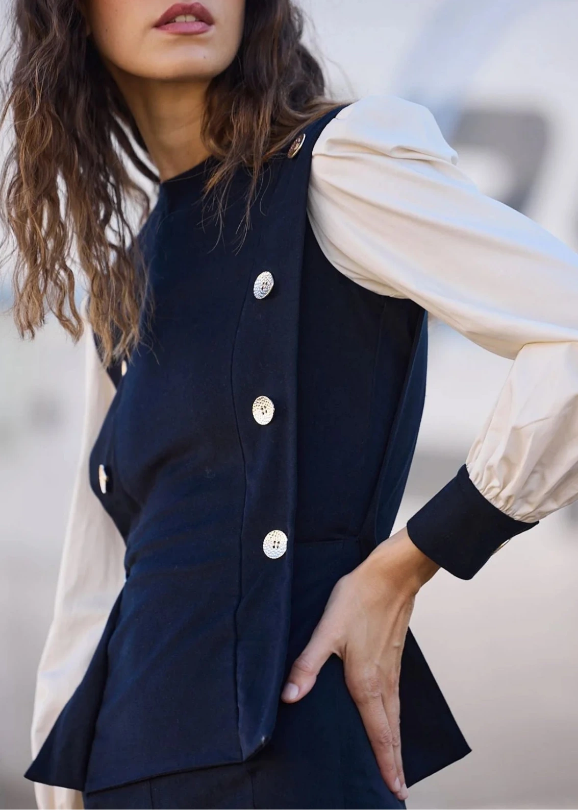 Detalle de botones dorados decorativos y cierre trasero con cremallera invisible.