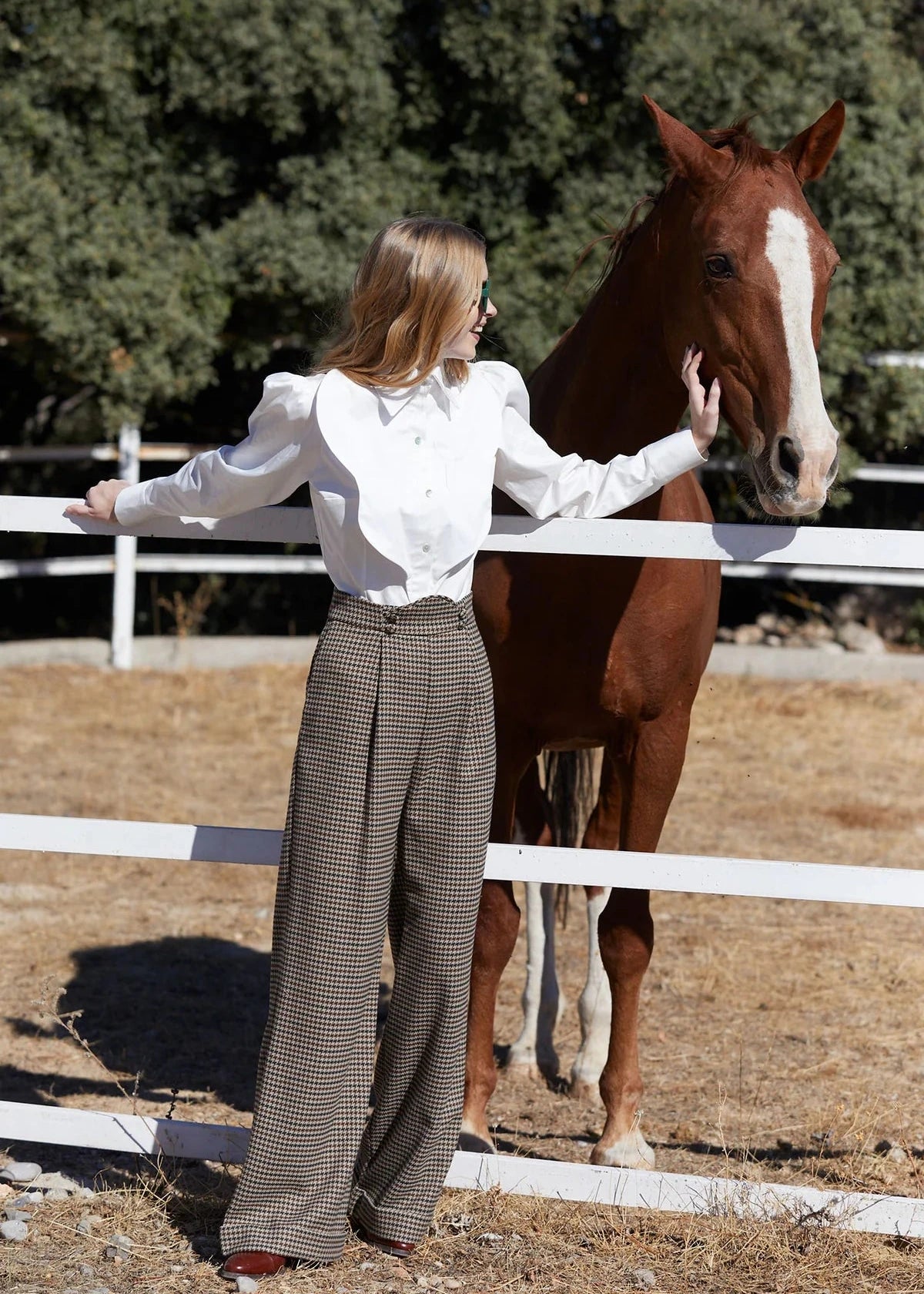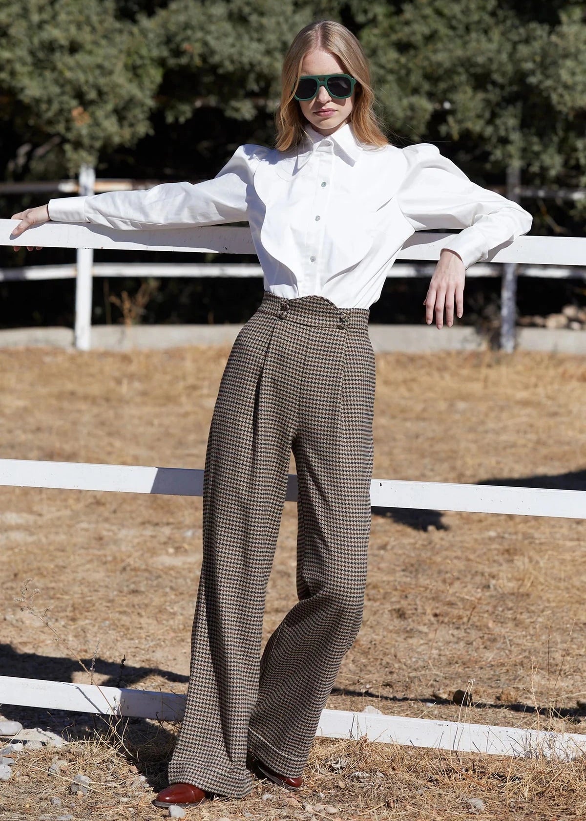 El pantalón Gales es la prenda ideal para un look sofisticado y versátil. Confeccionado en tejido de cuadros marrones, su diseño de pierna recta y caída fluida estiliza la figura, mientras que la cintura alta fruncida con lazada ajustable aporta un toque femenino y actual.