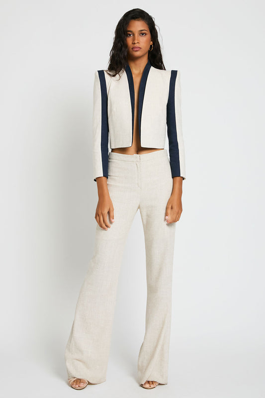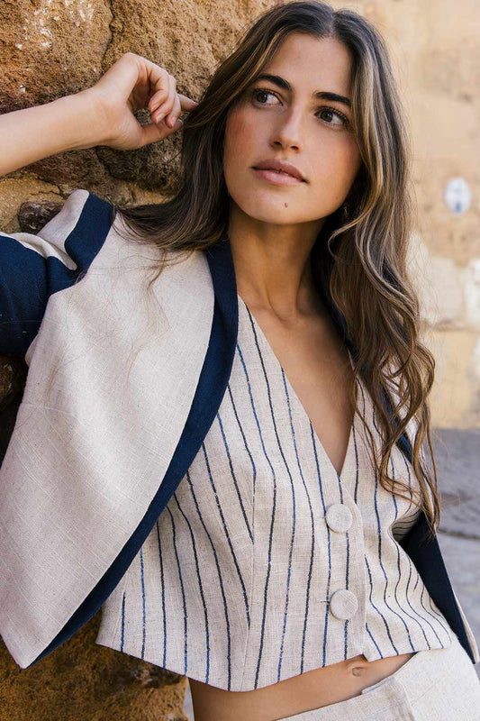 Top de diseño de corte evasé modelo Zahara en color beige con contraste en negro.