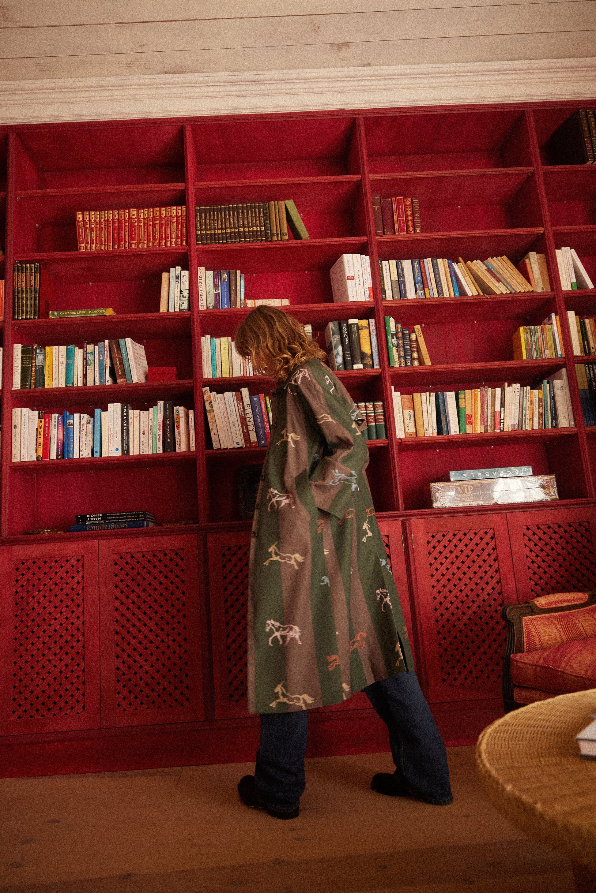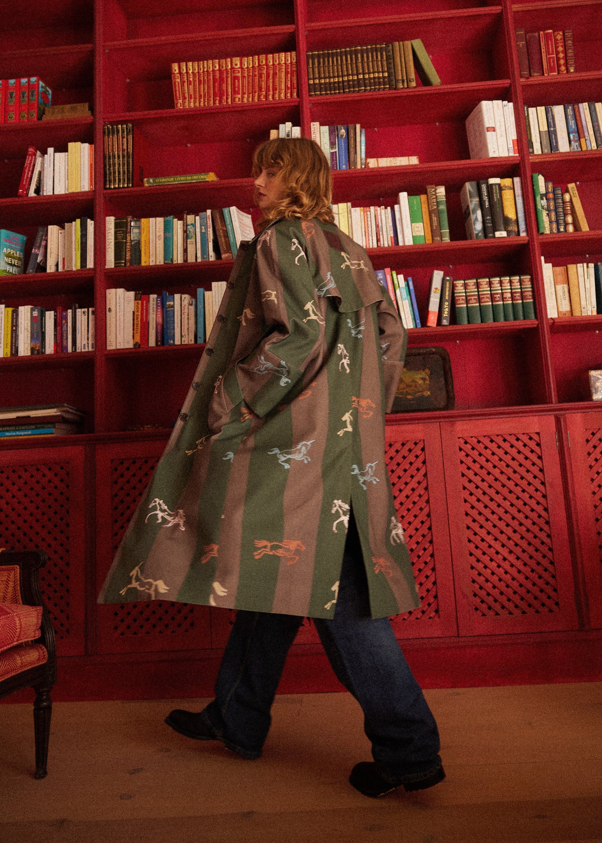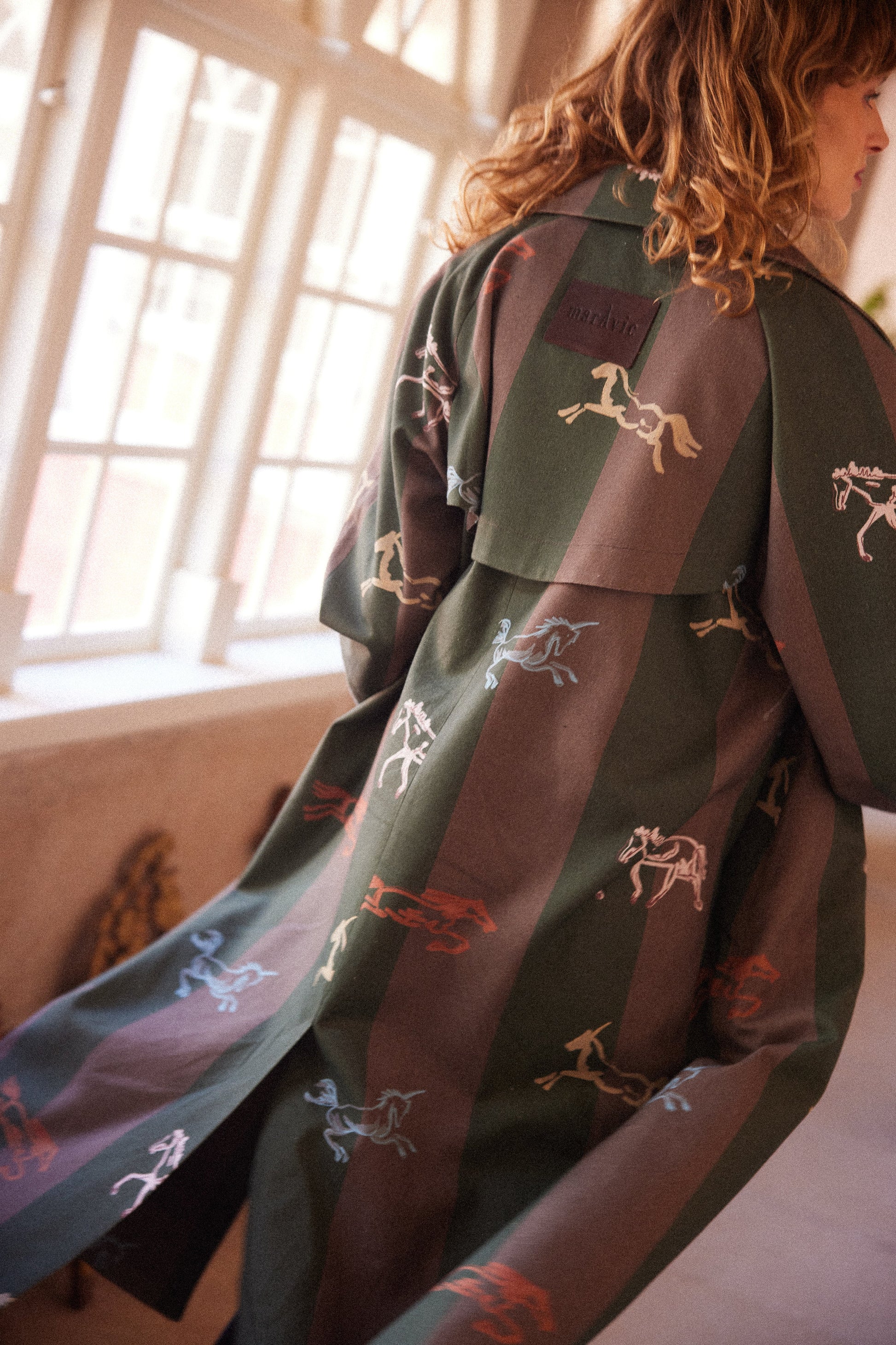 Gabardina a rayas verde y marrón con caballos, confeccionada en un tejido 100% algodón.