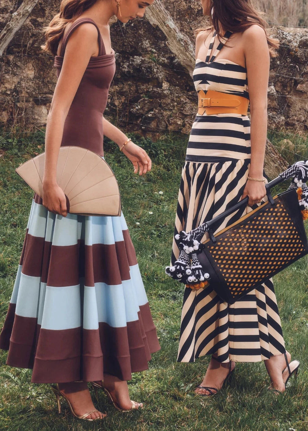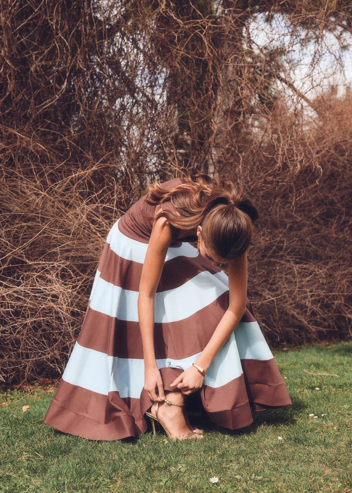 Vestido largo en color marrón arcilla con falda a rayas celeste.