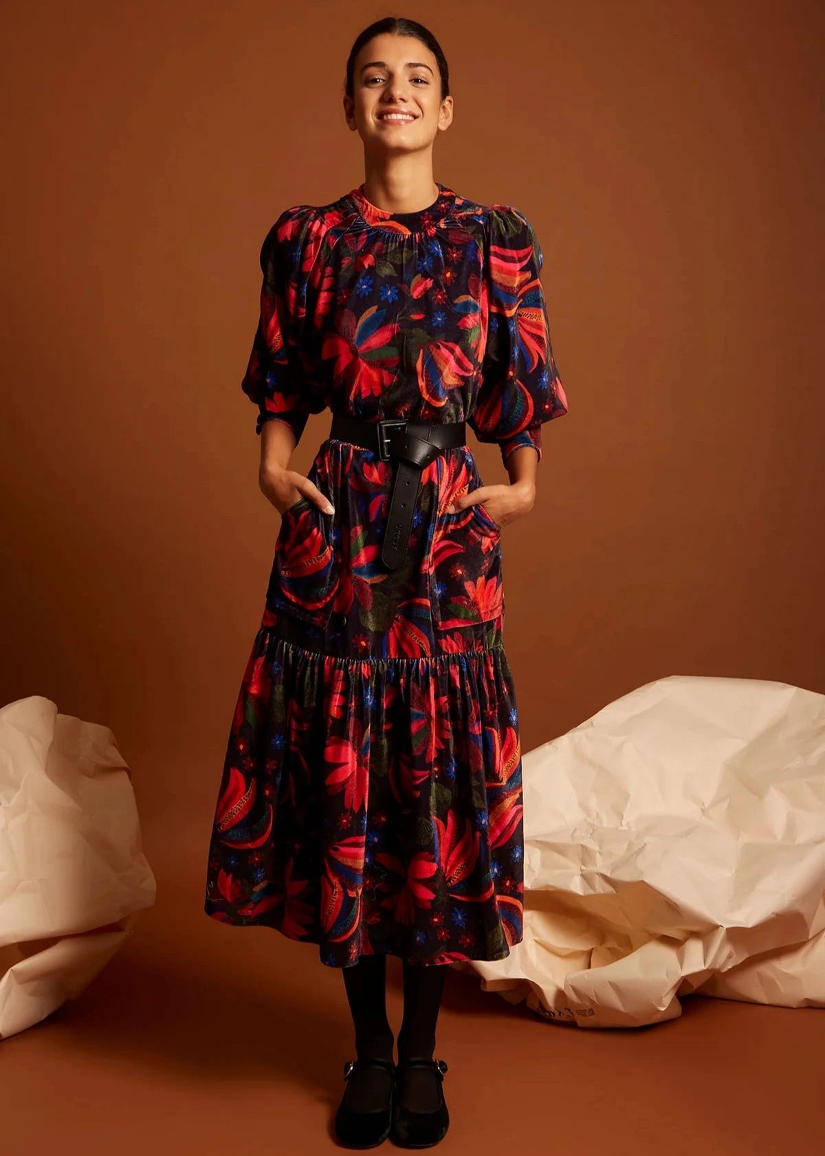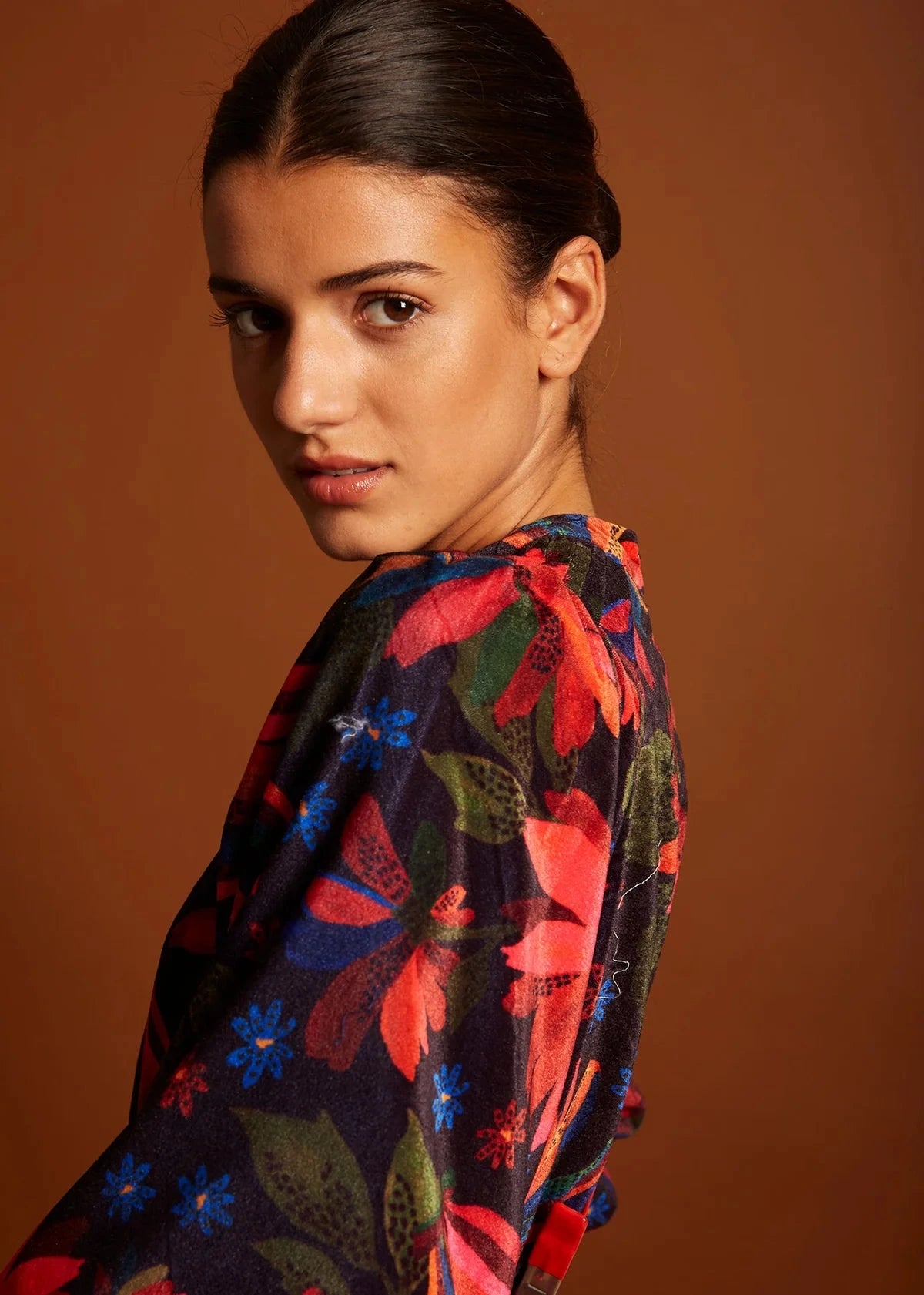 Confeccionado en un tejido fluido con estampado floral en tonos rojos, azules y verdes sobre fondo oscuro.