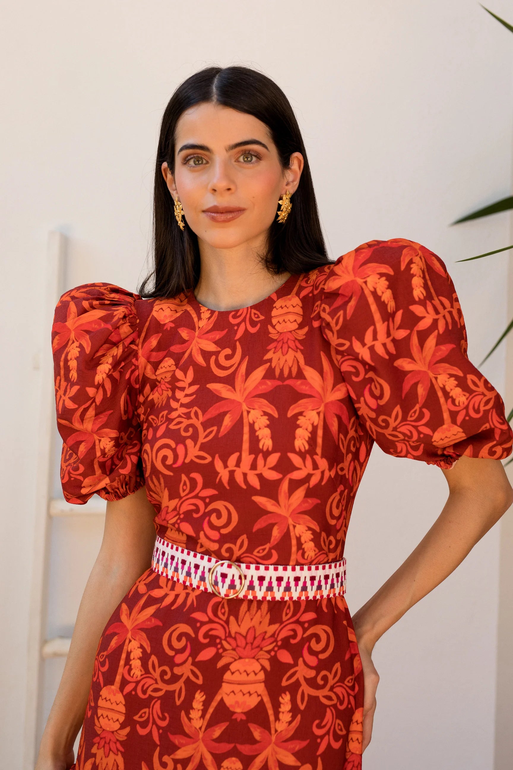 Vestido Doris confeccionado en lino estampado. Diseño elegante con mangas abullonadas y escote en pico. Los volantes aportan originalidad, el volante más alto ayuda a estilizar la figura, mientras que los tres volantes situados al borde aportan caída y firmeza. El detalle del cinturón reafirma y marca la cinturilla, ayudando de forma proporcional a la estructura de la prenda.
