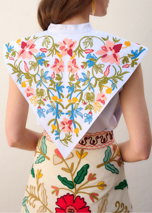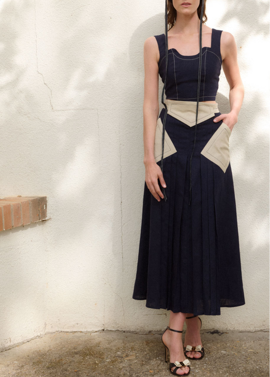 Hilera de 6 botones frontales forrados en jacquard que armonizan la prenda.
