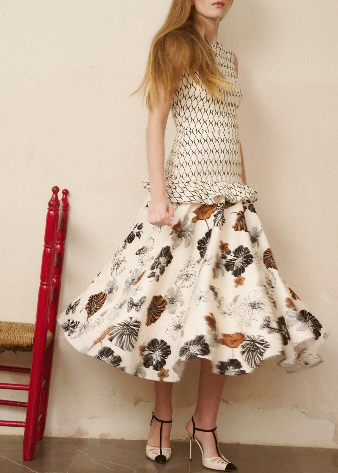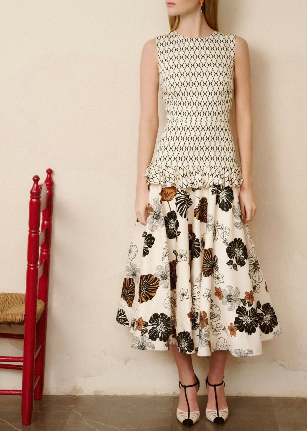 Mezcla de estampado geométrico con floral en tonos marrones y negros.