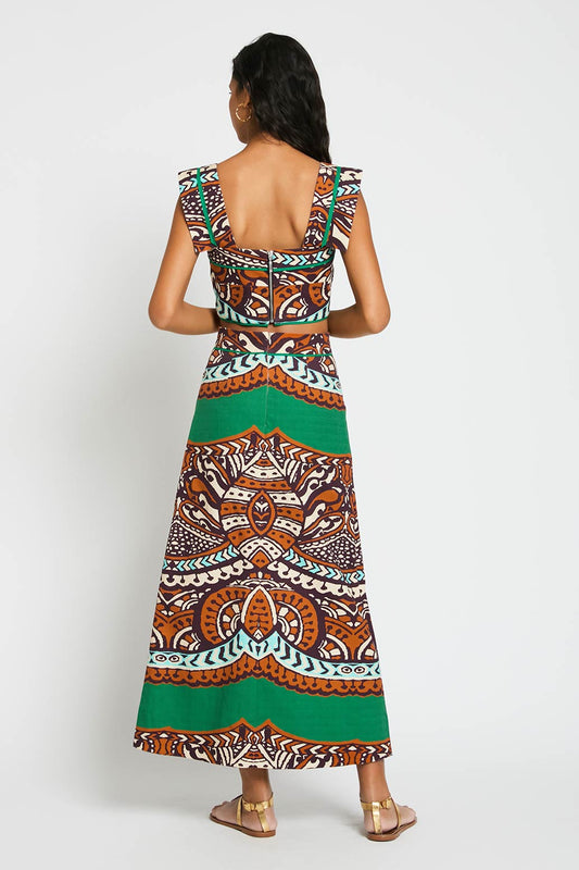 Vestido largo modelo Wisteria Masquerade de palabra de honor con estampado floral exclusivo de Bridgerton. Parte superior tipo corpiño y vuelo en la parte baja. Detalle de vivos a contraste en color negro y cierre trasero con lazada.